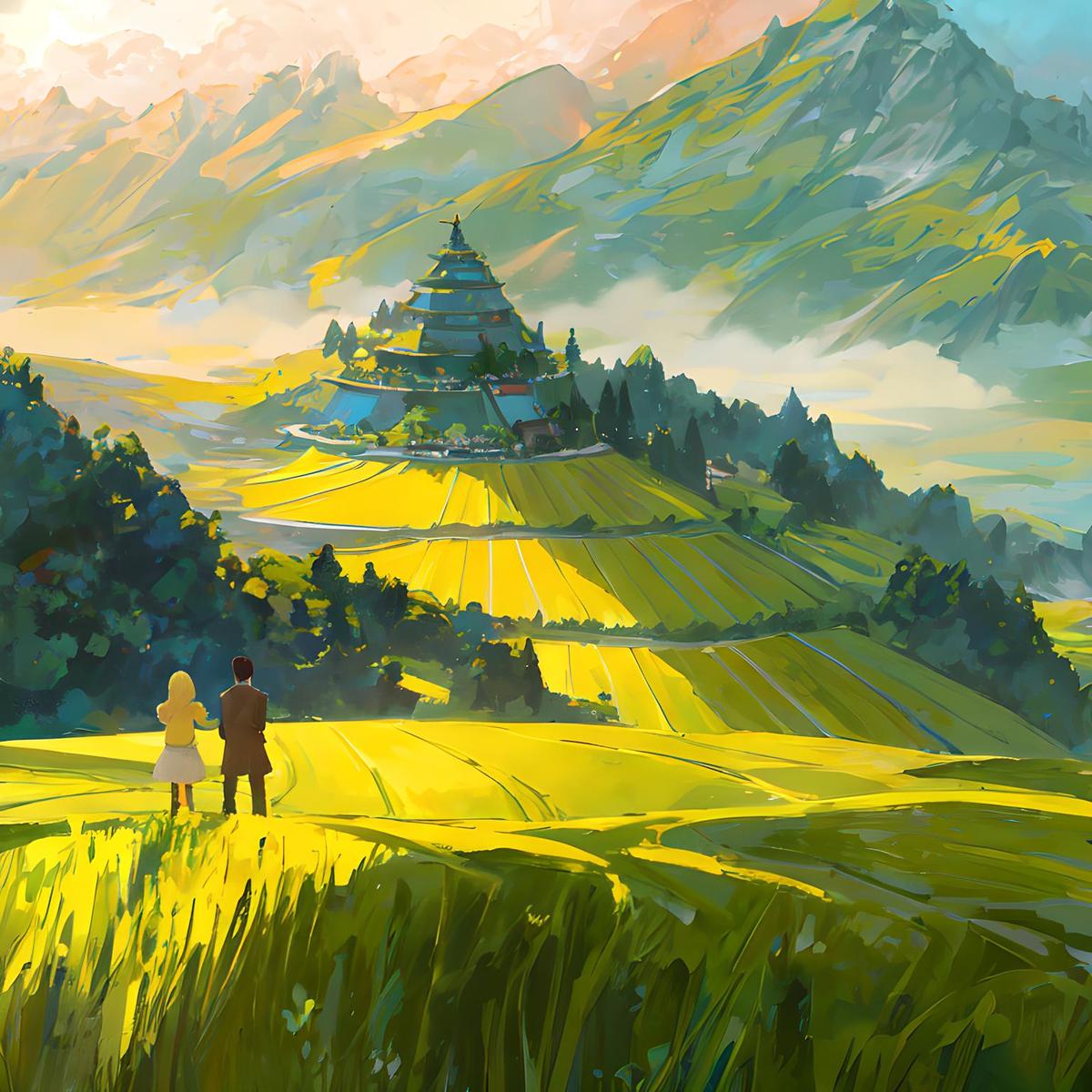 初夏的清晨一对情侣站在高高的山坡上俯瞰着自己辛勤劳作的稻田畅想着未来