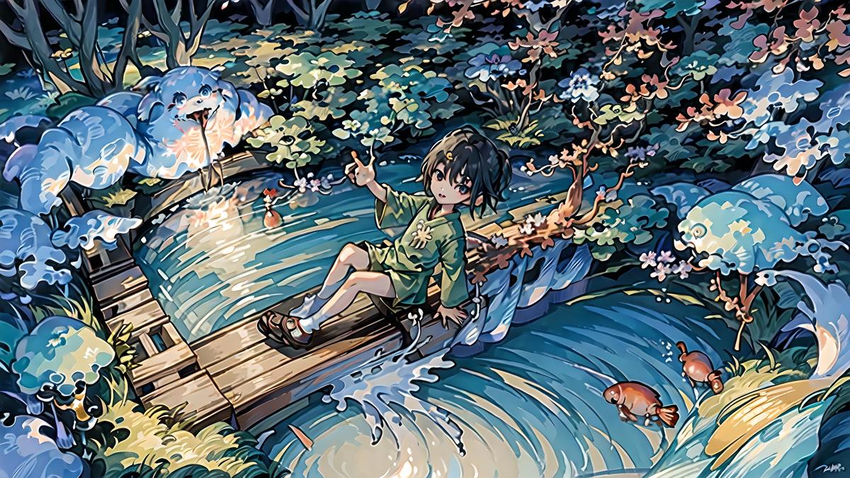 秋天,小溪边(小溪清澈见底,鱼虾共存),两个小孩,一个小男孩在钓虾,另一个小女孩...查看更多