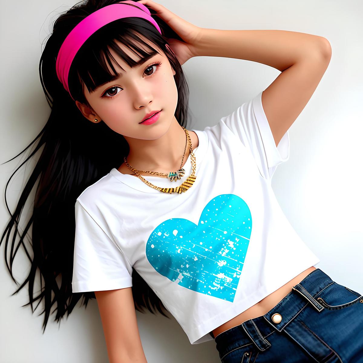 13岁的青春时尚少女穿着一件白色的宽松T恤,上面印有简洁的黑色字母图案。她搭配了一条修身的牛仔短裤,展露出健美的双腿线条。她的长发自然散落在肩上,装饰着一条亮丽的粉红色头带,配合她粉嫩的唇色和柔和的眼妆,整个人看起来充满活力和青春气息。她配戴着几个简单的饰品,如一枚细链项链和一只手镯,不过这些小巧玲珑的饰品并没有掩盖她本身的魅力。这位少女的穿搭展现了她喜欢尝试新鲜、前卫的时尚元素,同时也表达了她对自己体型的自信和对生活的热情。