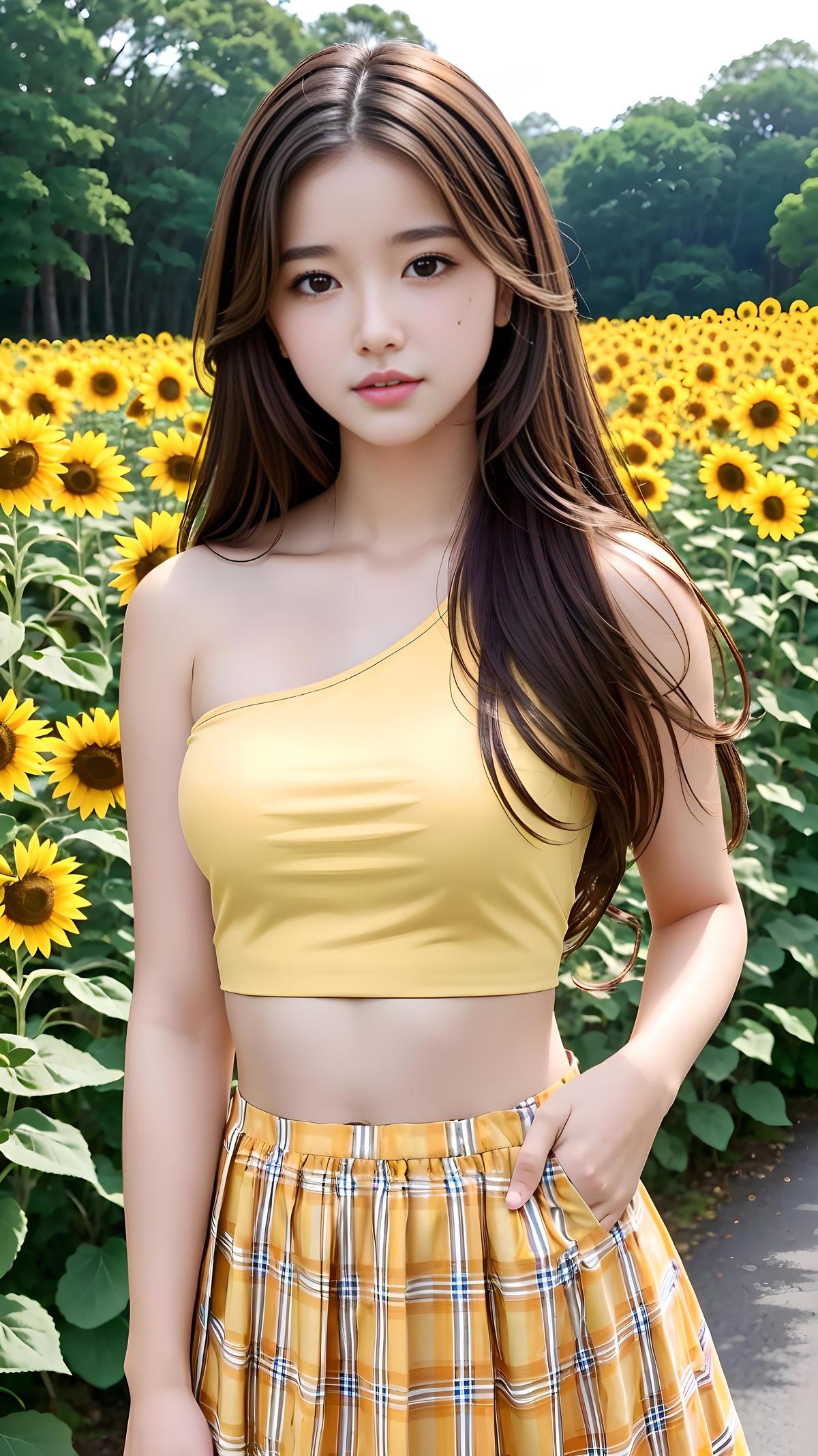 1girl, bare_shoulders, black_eyes, blurry, blurry_background, blurry_foreground, breasts, brown_eyes, brown_hair, collarbone, cosplay_photo, crop_top, depth_of_field, field, flower, flower_field, lips, long_hair, looking_at_viewer, medium_breasts, midriff, mole, outdoors, photo_background, plaid, plaid_shirt, plaid_skirt, red_skirt, skirt, solo, sunflower, yellow_flower