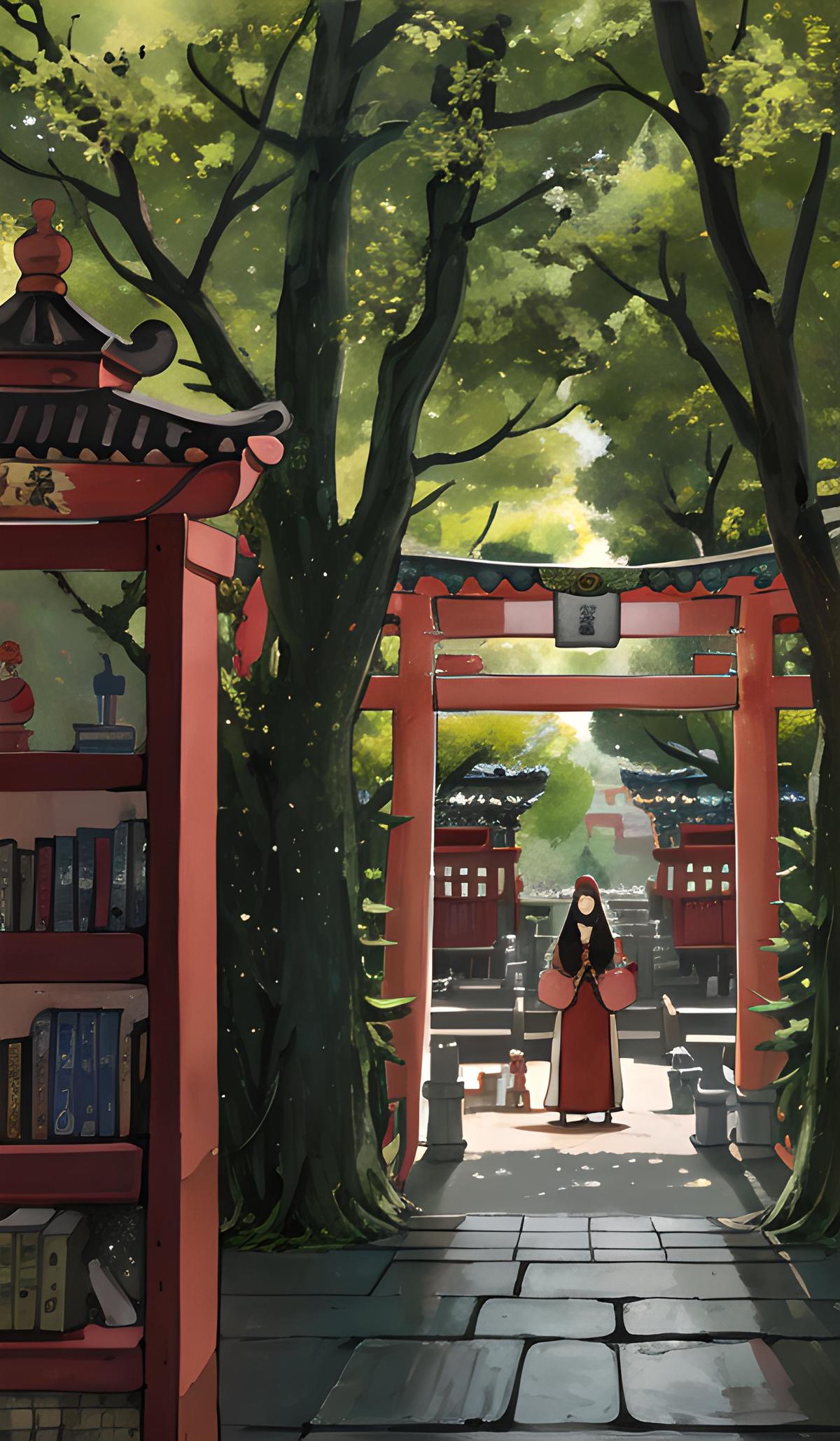 一位古装女子永宁寺祈愿,寺庙前面有一颗古树,古书上挂满红条