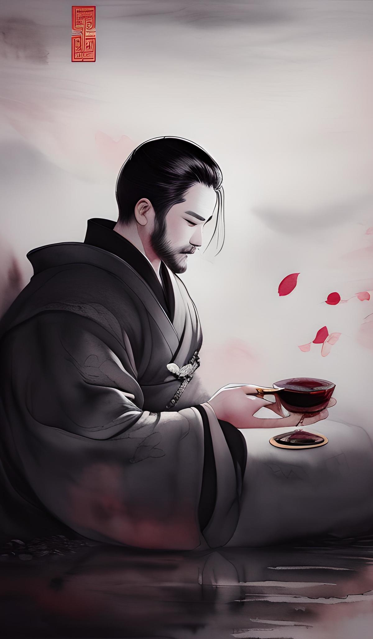 男人侧躺 手中一杯酒 桃花树下 夜晚月色明亮 湖中倒影