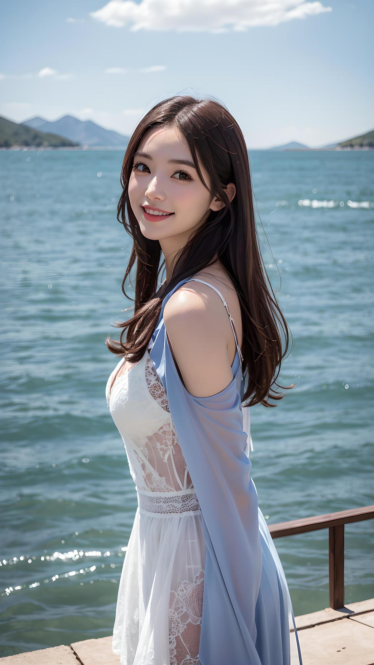 原创,杰作,哈苏相机拍摄,一个穿着时尚女装的女模特,皮肤白皙,她的笑容灿烂,正在洱海边进行旅拍。她的服装时尚,与美丽的洱海景色形成鲜明对比,人物位于画面的中央,呈现出写实风格。大师作品,摄影风格,正面视角,半