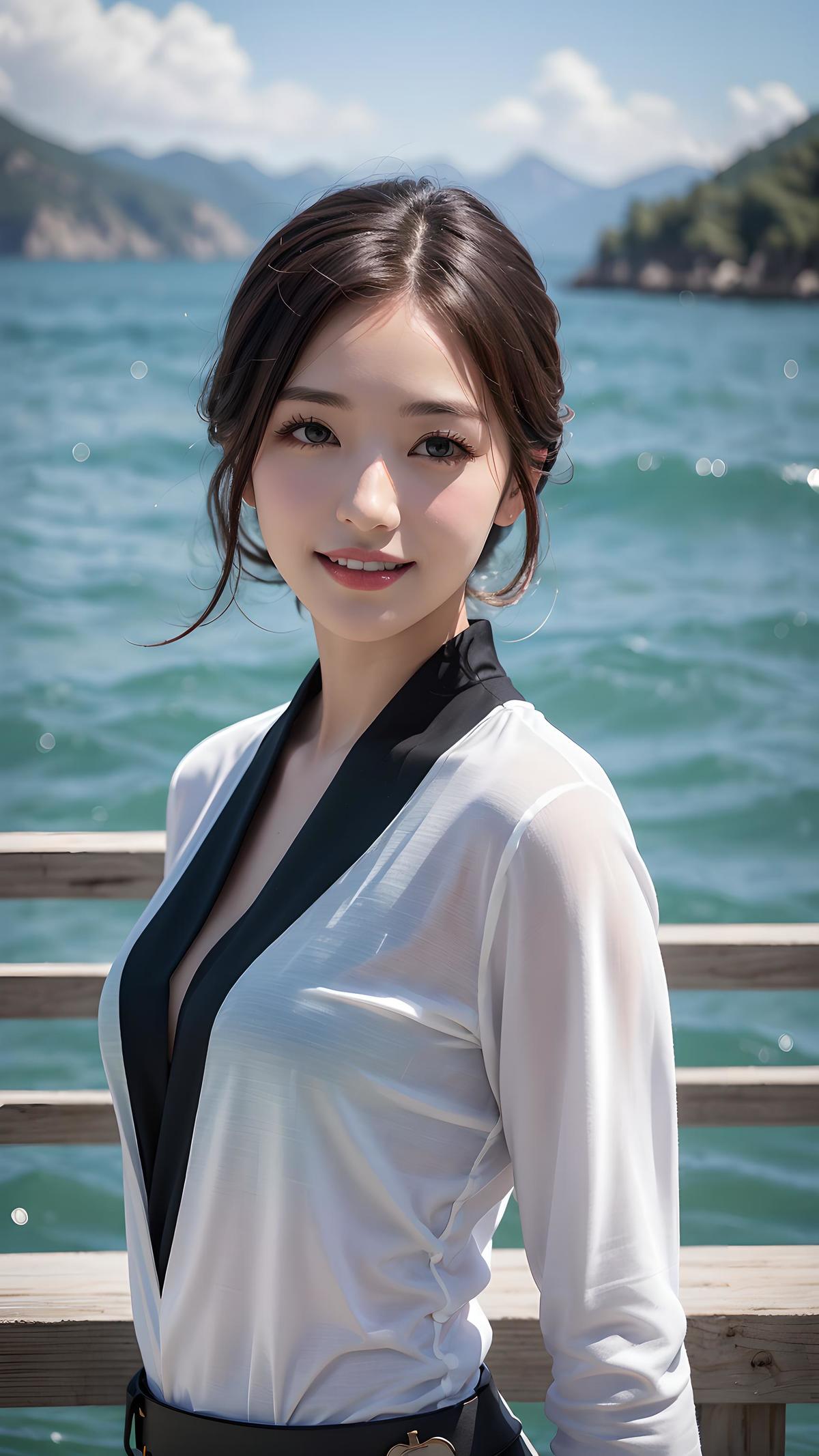 原创,杰作,哈苏相机拍摄,一个穿着时尚女装的女模特,御姐,皮肤白皙,她的笑容灿烂,正在洱海边进行旅拍。她的服装时尚,与美丽的洱海景色形成鲜明对比,人物位于画面的中央,呈现出写实风格。大师作品,摄影风格,正面视角,半