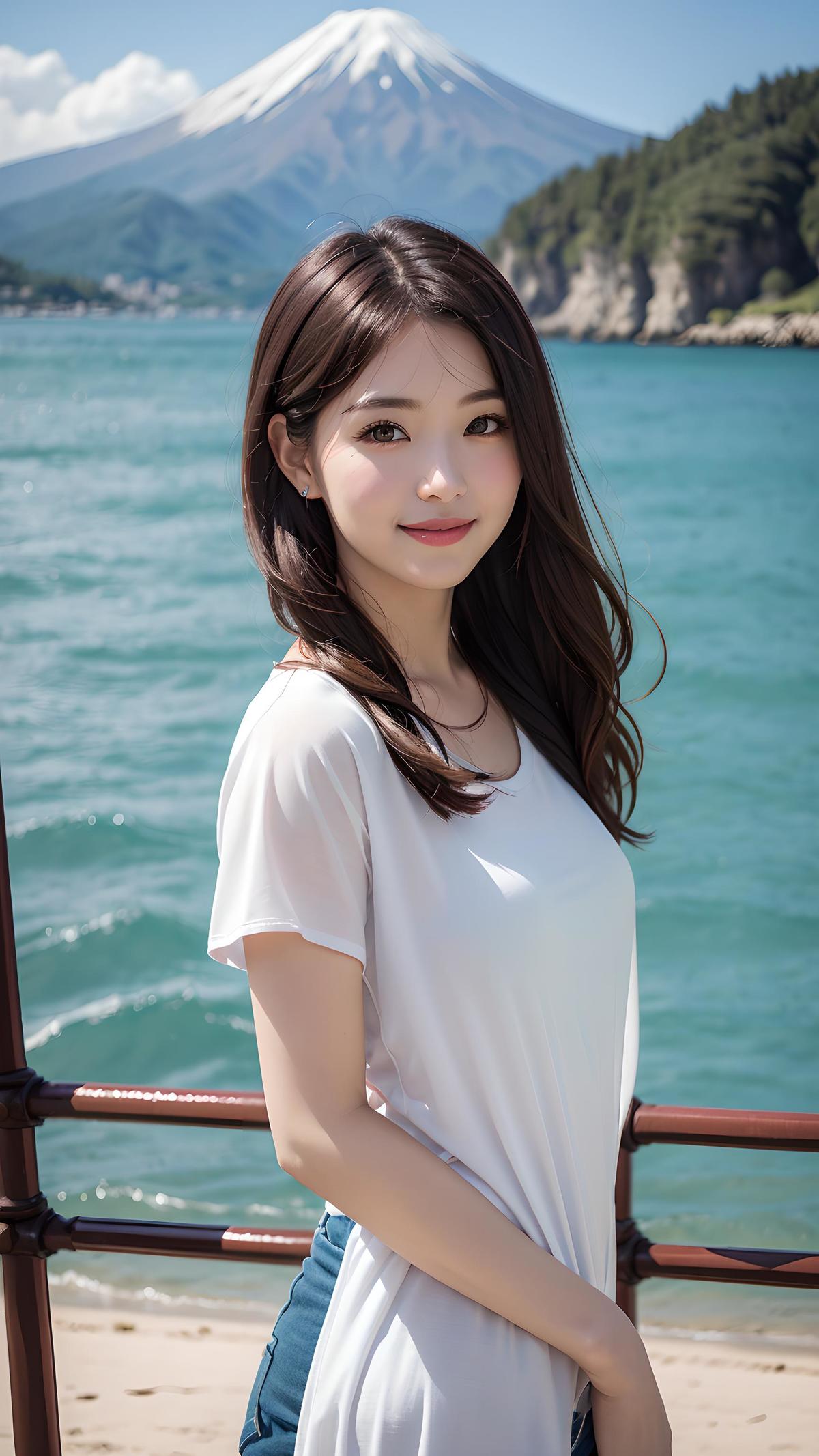 原创,杰作,富士X-T5 拍摄,一个穿着时尚女装的女模特,御姐,皮肤白皙,她的笑容灿烂,正在洱海边进行旅拍。她的服装时尚,与美丽的洱海景色形成鲜明对比,人物位于画面的中央,呈现出写实风格。大师作品,摄影风格,正面视角,半