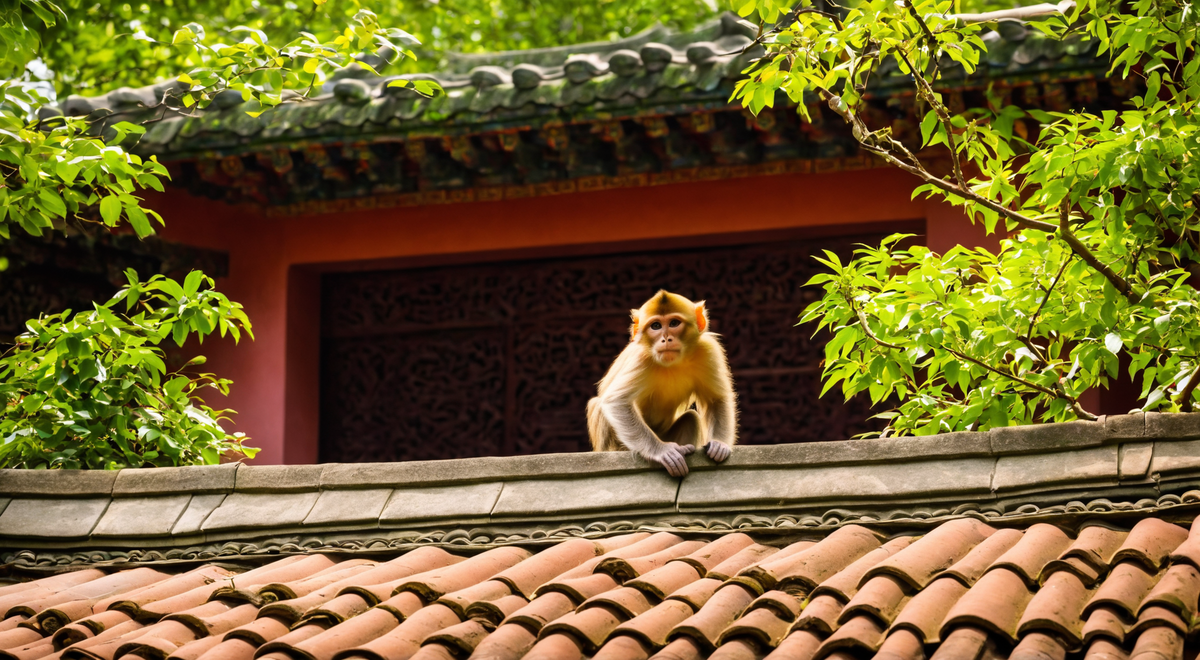 在这幅画面中,我们的视线首先被一座典型的中国古典建筑所吸引。一只顽皮的小猴子,尾巴轻巧地卷在屋檐的翘角上,它的眼神中透露出对这个世界的好奇与顽皮,仿佛随时准备跳跃到另一处探险。在建筑周围,茂密的绿树环绕,它们以各种姿态伸展着枝叶,为这个场景带来了生机与和谐。阳光从树梢间洒落,形成斑驳的光影,为红瓦屋顶和绿树投下金色的光晕。