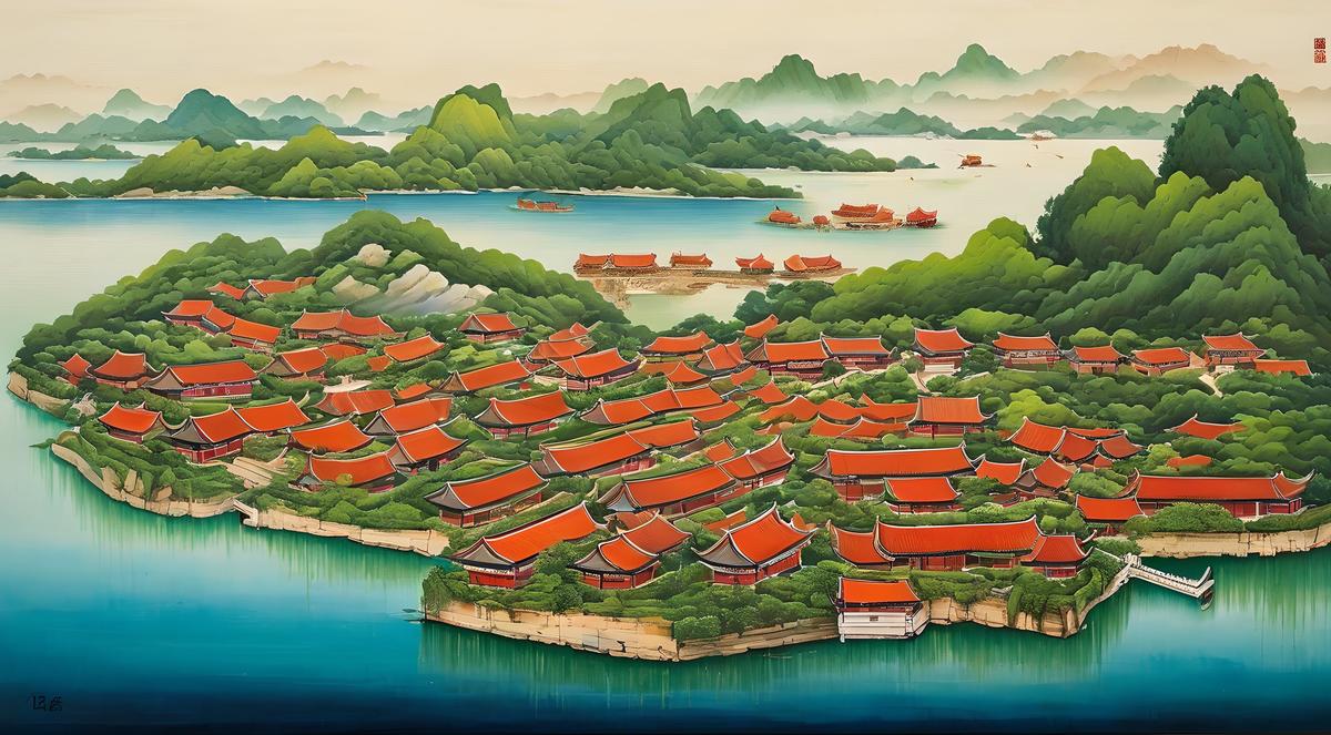 There are some old Chinese red tile roofed houses on the island,osmanthusIsland,aerial perspective,osmanthusIsland on the surface of the lake,the vast lake surface,a lush island,