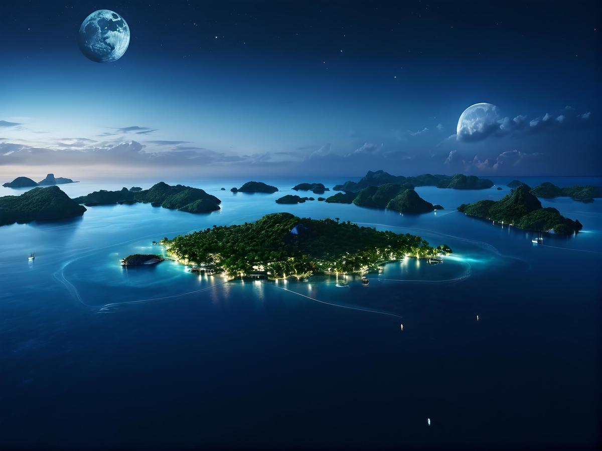 五个岛,湖,灯光,夜晚,月亮,明亮