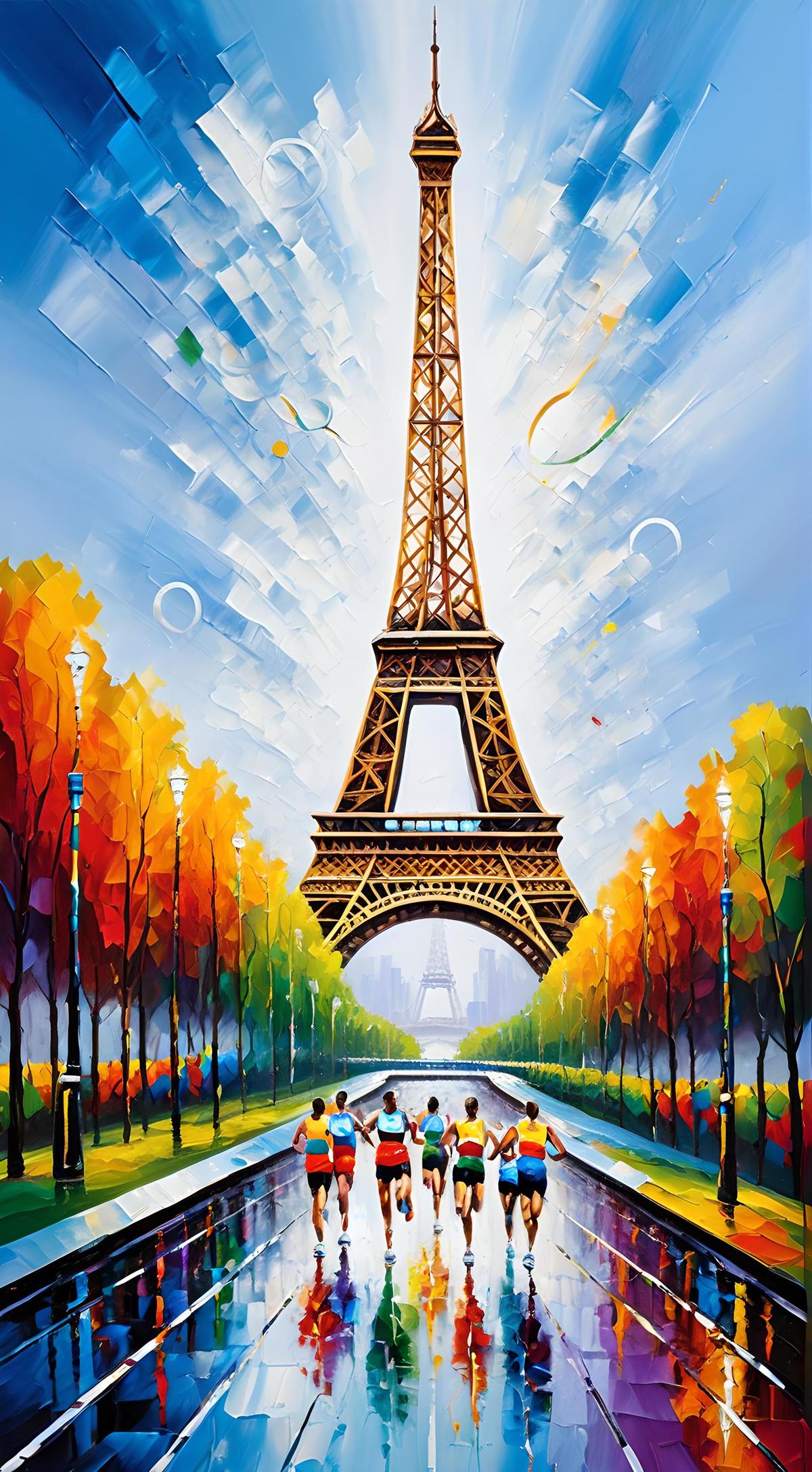 背景色彩明亮鲜艳,埃菲尔铁塔,奥运会,奥运五环,跑步的人,跑道,抽象风格