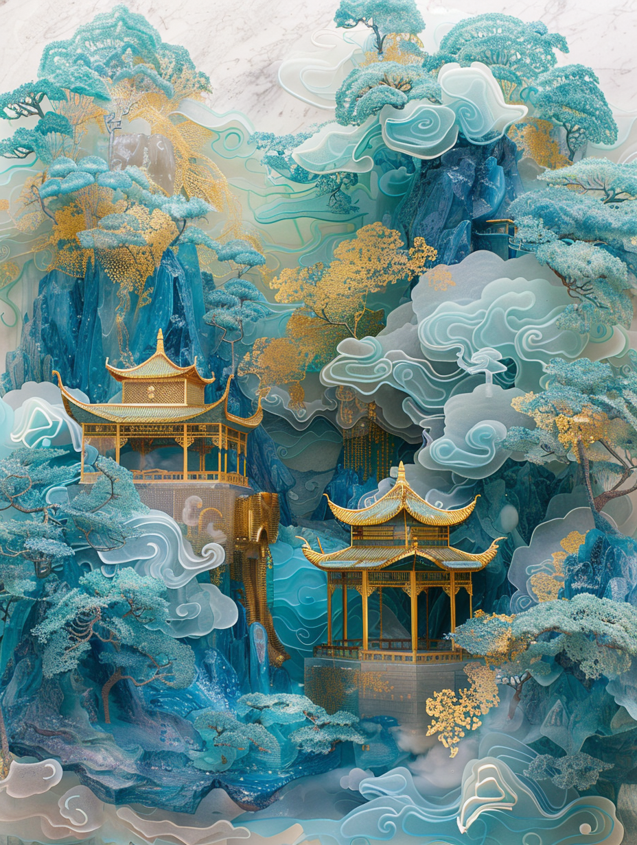 inthe style of intricate psychedelic landscapes, luminous 3d objects, artist xindezhong explores the concept of chinese golden palace in a cyan and gold piece, ethereal cloudscapes,use of paper,layered translucency, luminous imagery