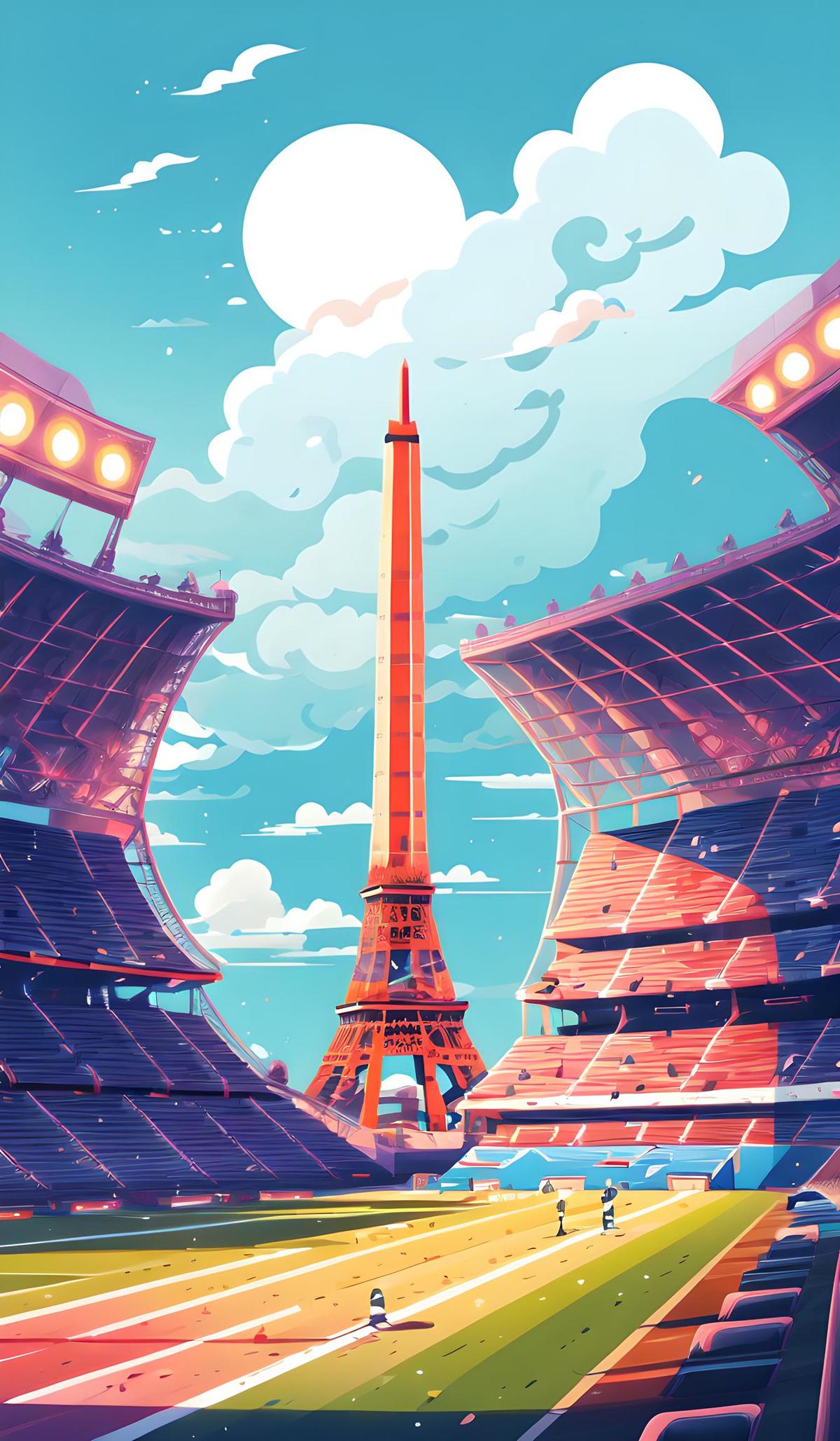 2024年夏季奥运会巴黎奥运会的一幕,运动员身着运动服,他们的身体被体育场明亮的灯光照亮,创造了一种充满活力、充满活力的氛围,具有奥运精神。