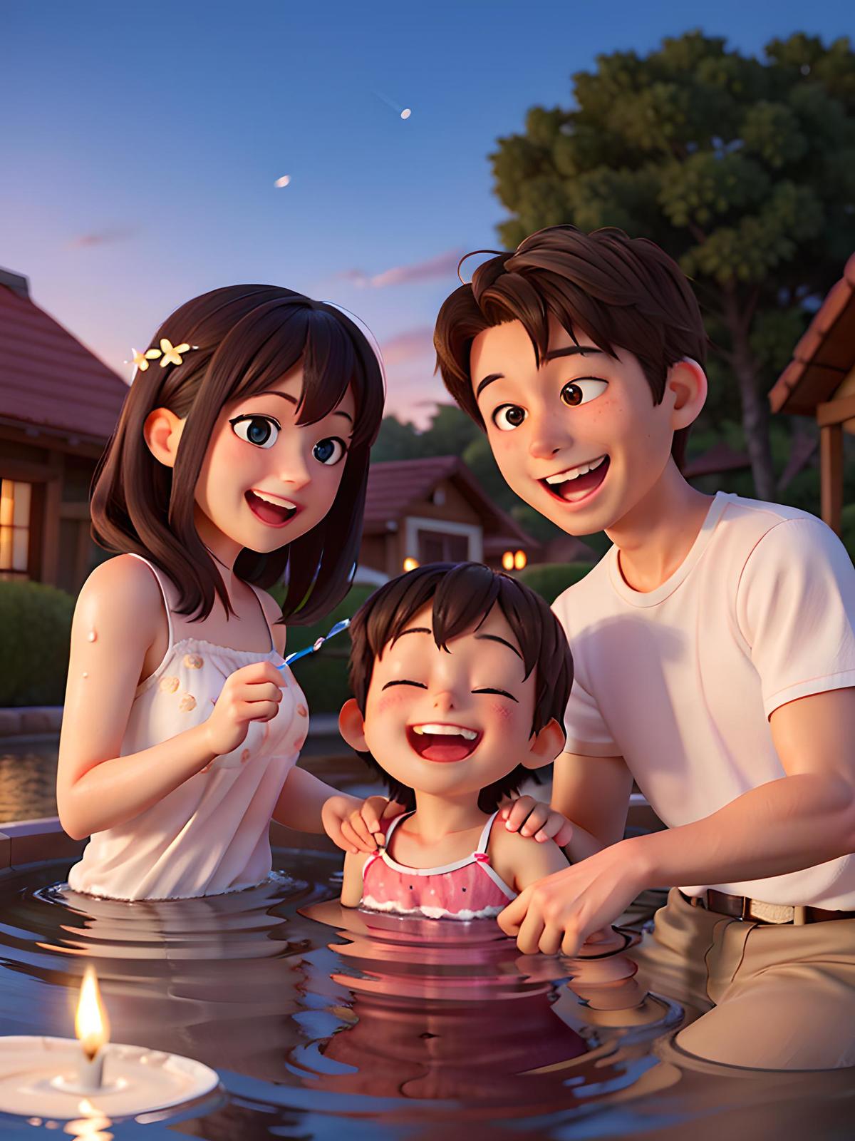 在温泉度假村,一家三口共享欢乐时光。父母依偎在温暖的泉水中,孩子欢快地在旁泼水嬉戏。月光洒落,水面波光粼粼,映衬着他们的笑脸。欢笑声此起彼伏,构成了一幅幸福温馨的画卷,充满了家的温暖与和谐。