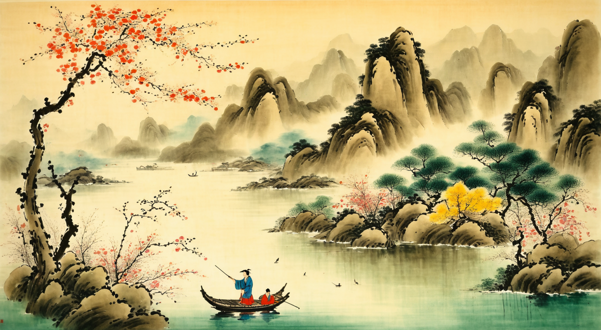 以国画山水意境的风格,呈现出早春泛舟的惬意氛围春。老宁静与活力交织,老祖宗传下来...