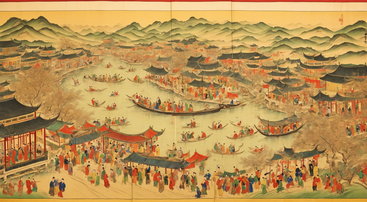 清明上河图,热闹的街道人来人往,有如多小摊,画面清晰,中国风,