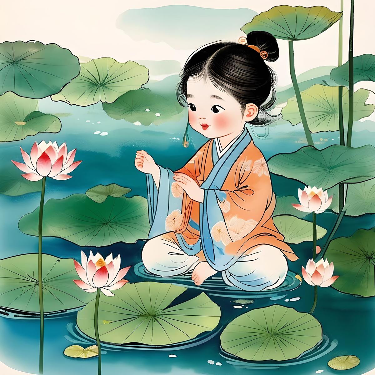 徐悲鸿儿童插画设计作品。水墨画 童趣 嬉戏 荷花 游玩 氛围感极强 小孩开开心心 蹦蹦跳跳 有故事趣味性