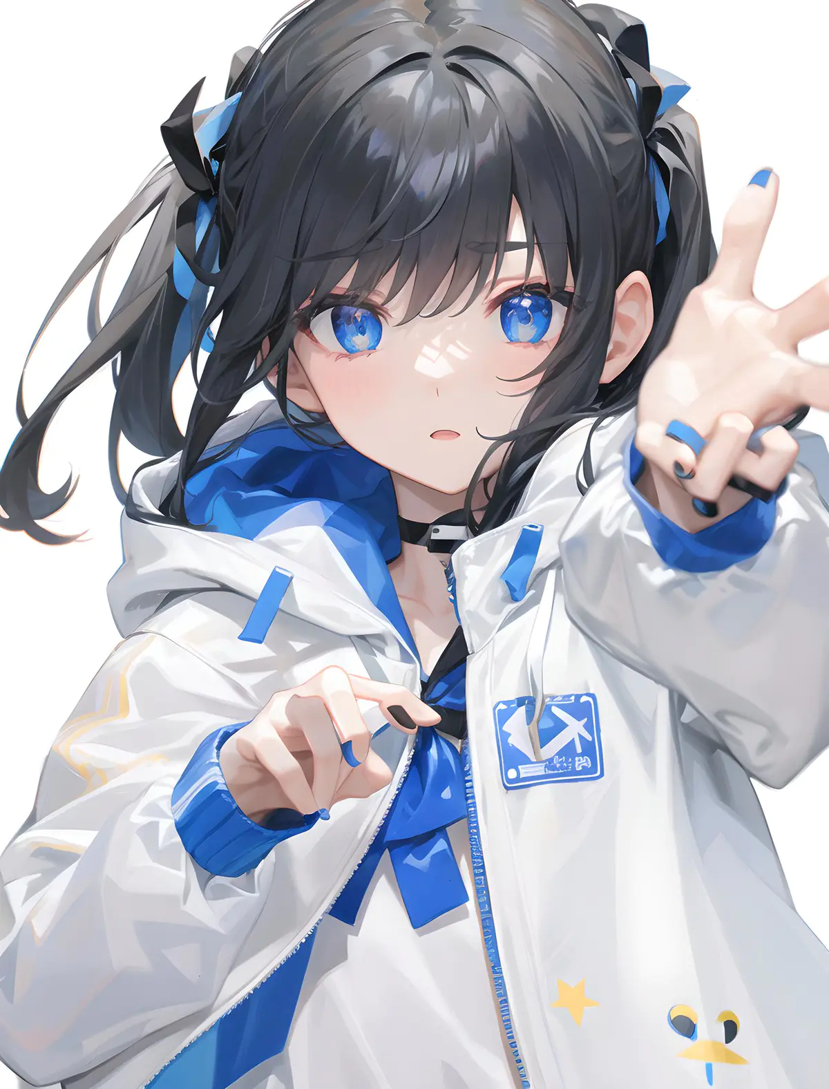 1girl,bangs,black_hair,black_nails,blue_bow,blue_choker,blue_eyes,blue_nails,blue_ribbon,blurry,blurry_foreground,bow,choker,depth_of_field,drawstring,eyebrows_visible_through_hair,fingernails,hood,hood_down,hooded_jacket,hoodie,jacket,long_hair,long_sleeves,looking_at_viewer,nail_polish,open_jacket,outstretched_arm,puffy_long_sleeves,puffy_sleeves,reaching_out,simple_background,solo,twintails,upper_body,white_background,white_hoodie,white_jacket