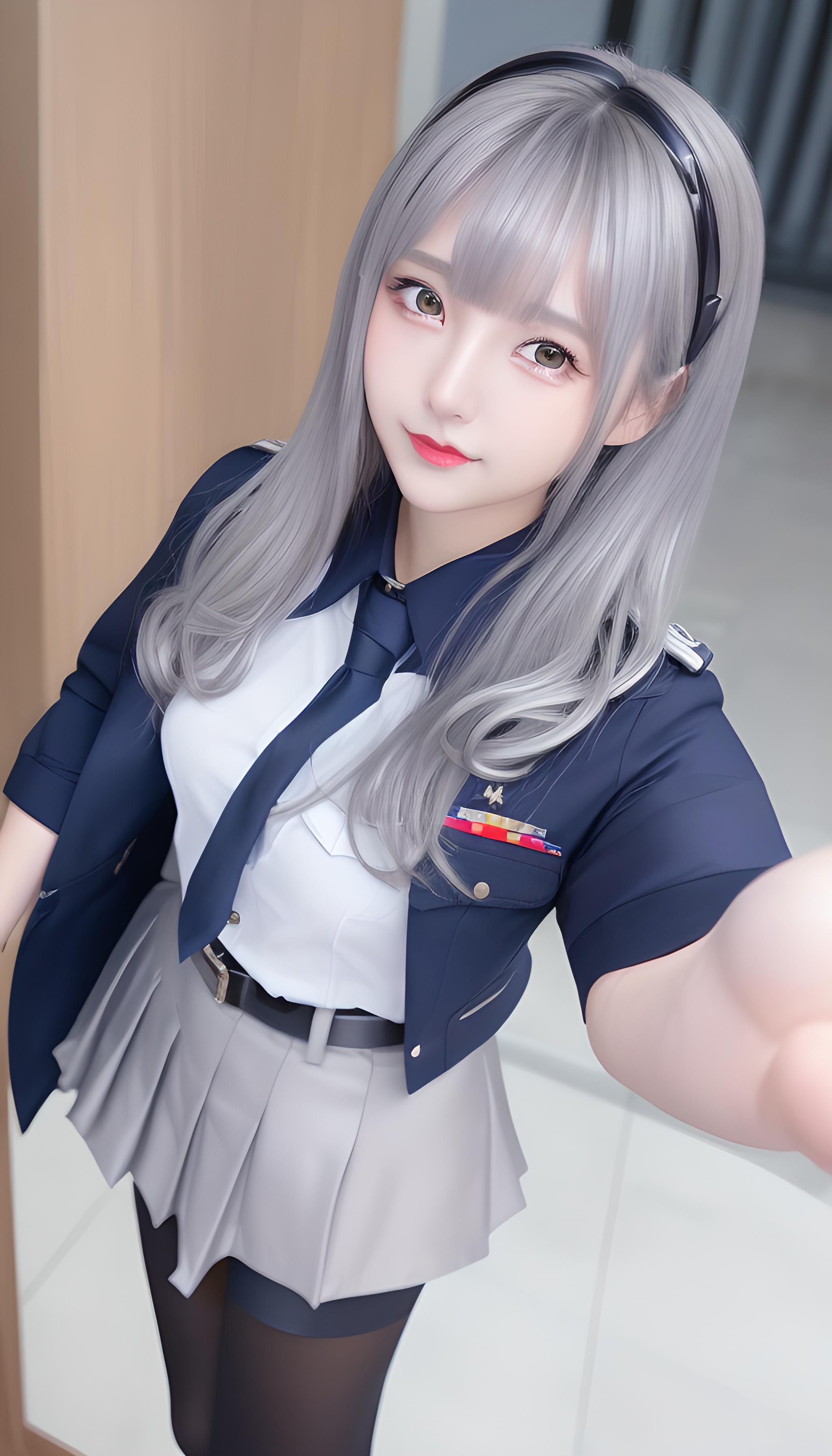 (((大师作品))),(((最好画质))),更高质量,((高细节)),(((超高分辨率))),(((8k分辨率))),(女孩),((单人)),微距镜头,警察,口红,嘟嘴,兔子耳朵,水汪汪大眼,脸红,微笑,((中发)),((头发过肩)),((卷发)),((眉间刘海)),蓬发,((齐刘海)),((((银发)))),((职场制服)),((西装)),军装,百褶裙,海军陆战队服,腰带,((裤袜)),((动态角度)),((向上看)),室内,咖啡馆