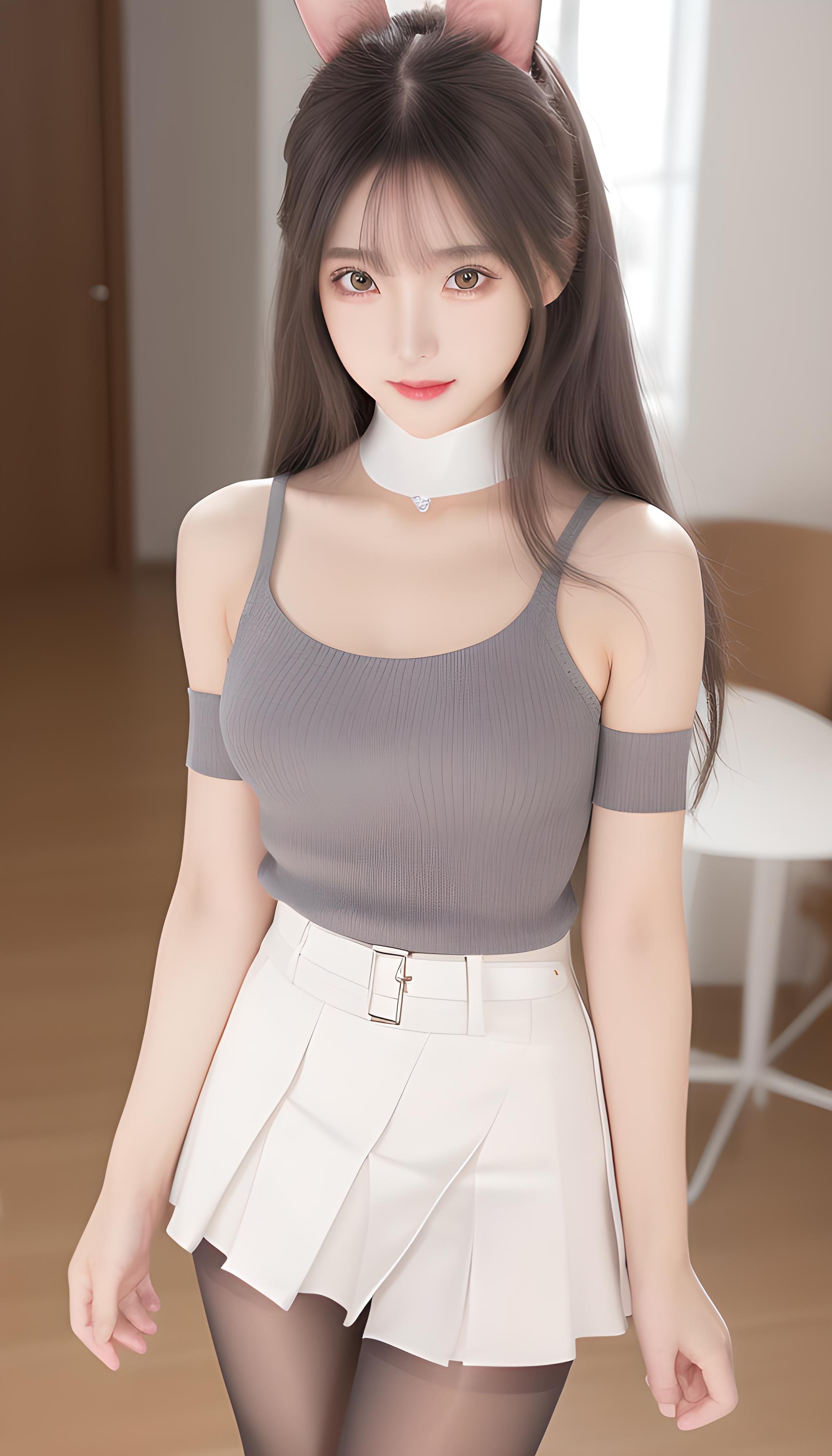 咒语(Prompt): 高清,微距镜头,警察,兔子耳朵,军装,百褶裙,海军陆战队服,腰带。高清,美少女,8k画质,最佳画质,巨胸,对镜头微笑,妩媚温柔,背影,丰满(((包臀裙))),(((齐b短裙))),(((灰色裤袜))),露腿,完美身材,S型,完美身材比例,完美腿部线条,细腰,精致五官,非常可爱,水汪汪的大眼睛,紫色瞳孔,眼影,长睫毛,脸红,红色嘴唇,,银白的头发,全身特写,(现代),超现实,阳光明媚,细节光线,优雅的姿势,(latex dress,hotpants,tank top),((grey_pantyhose)),细节丰富,微笑,害羞,可爱,动人美女,8k分辨率,超高分辨率,一个16岁稚嫩少女可爱的少女,彩色清澈眼眸,顺滑的头发,高马尾,锁骨,精致完美的五官,最美的大眼睛,长睫毛,眼睛甜美有卧蚕,微笑,动态角度,极致画质,最高精度,精确完美的人体结构,(粉色超薄露肩针织毛)站姿