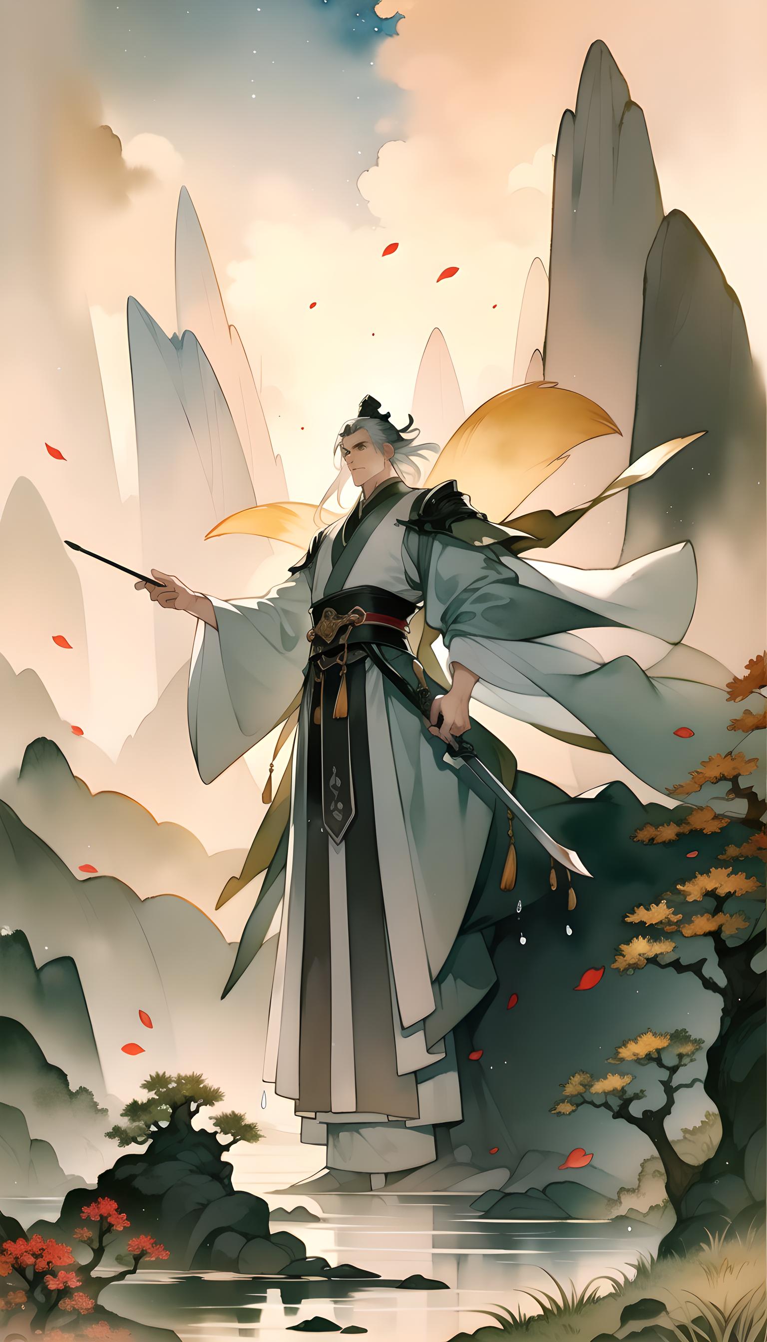 持剑面对瀑布