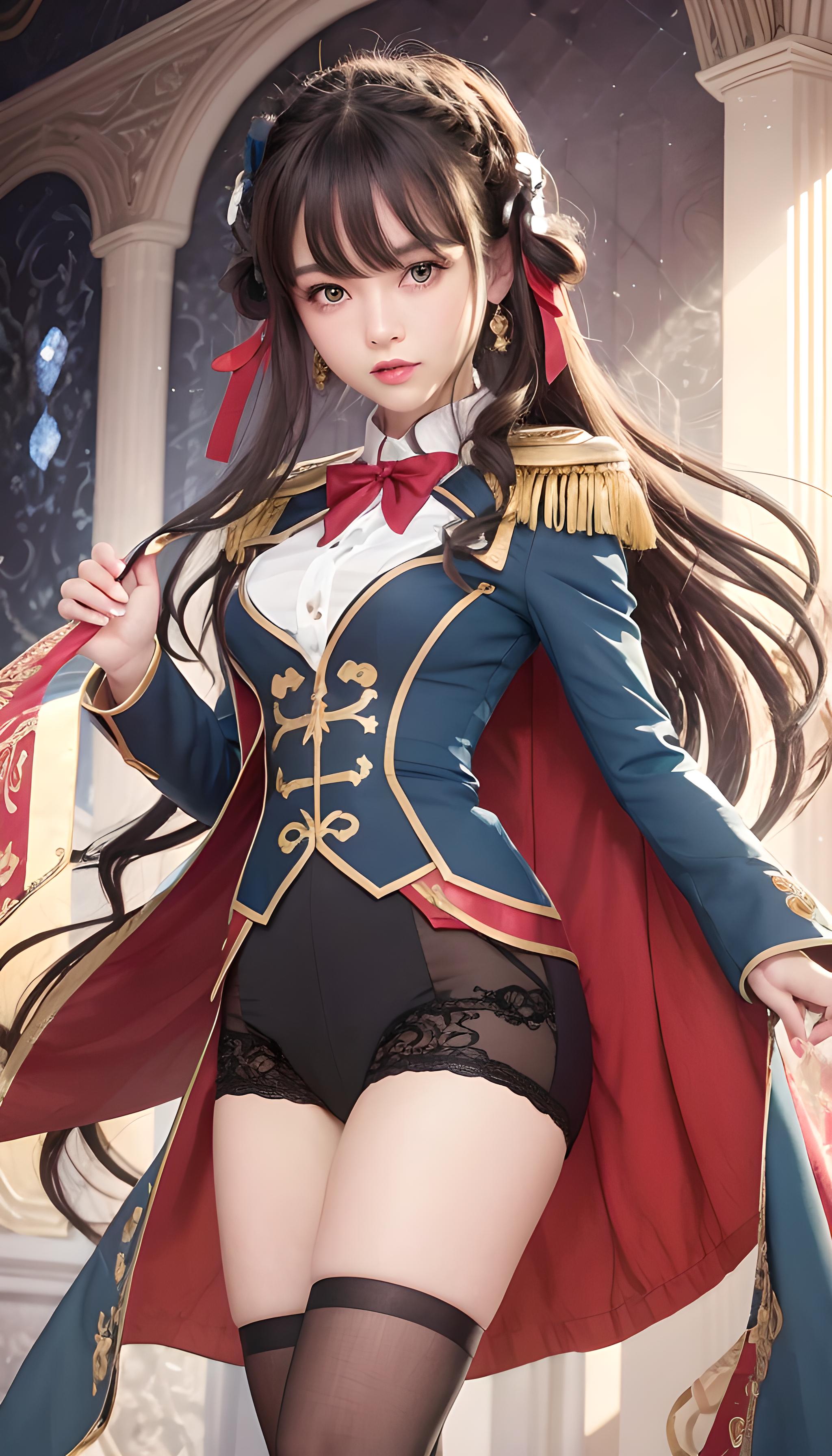 最高画质,杰作,精美的CG,画面丰富、绝美的,迷人的,完美,一个机甲可爱的小罗莉,精致的五官,蓝色的眼睛,黑色的卷发,红丝带盘发,精致的妆容,红色的嘴唇,蓝白色西装外套,黑色短裤丝袜,大象标志红丝带,极其精致,美丽,真实质感,现实感,逼真,手脚无损,画质高清,背景是天马行空大象图案,灯光闪耀,光影 景深 韩系动漫风