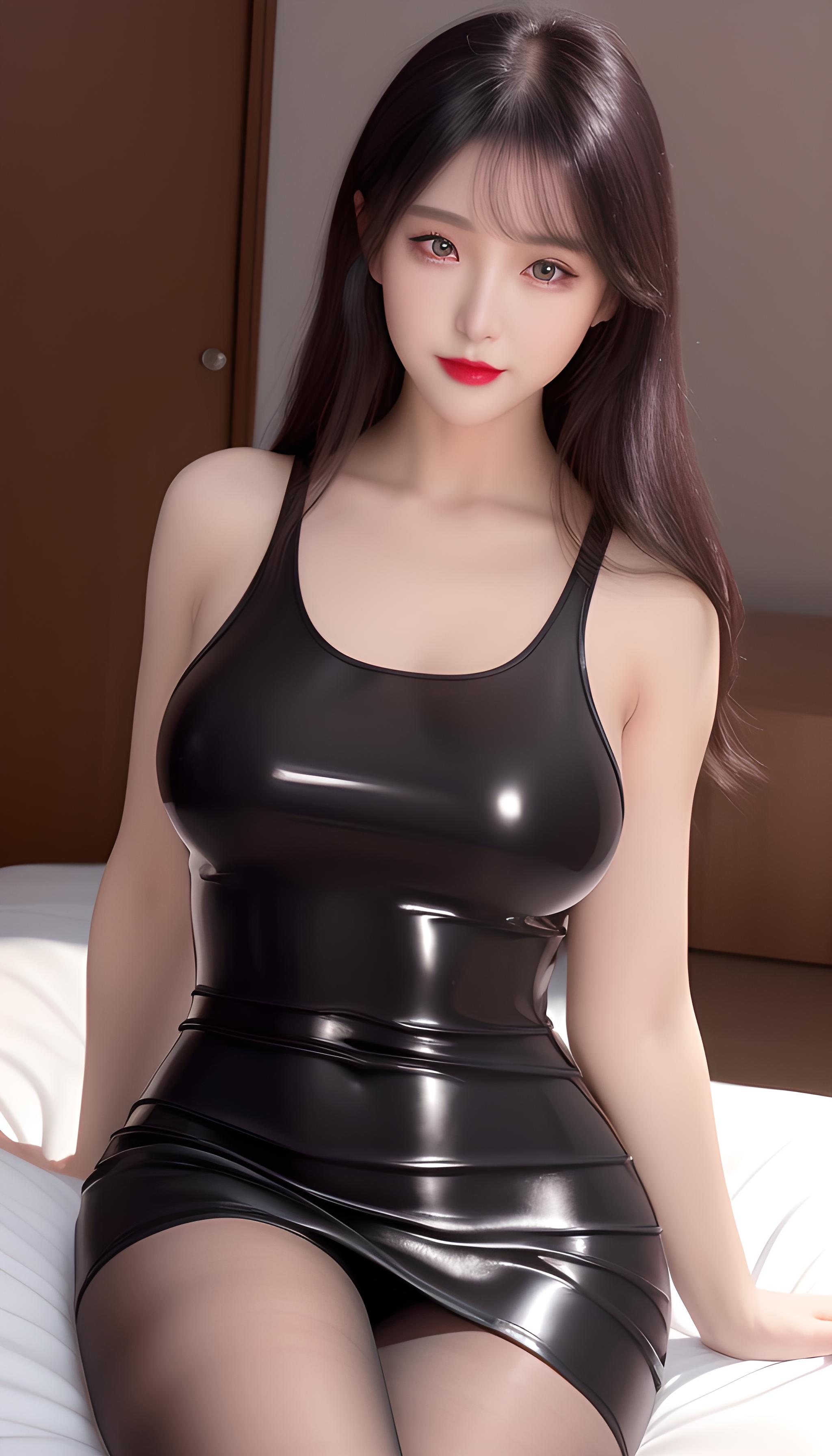 青春靓丽的少女,巨胸,黑丝,细腰,精致五官,非常可爱,水汪汪的大眼睛,紫色瞳孔,眼影,长睫毛,脸红,红色嘴唇,,银白的头发,坐在床上,全身特写,(现代),超现实,阳光明媚,细节光线,优雅的姿势,(latex dress,hotpants,tank top),俯视的镜头,((grey_pantyhose)),丰富,微笑,害羞,可爱,丰满女人,