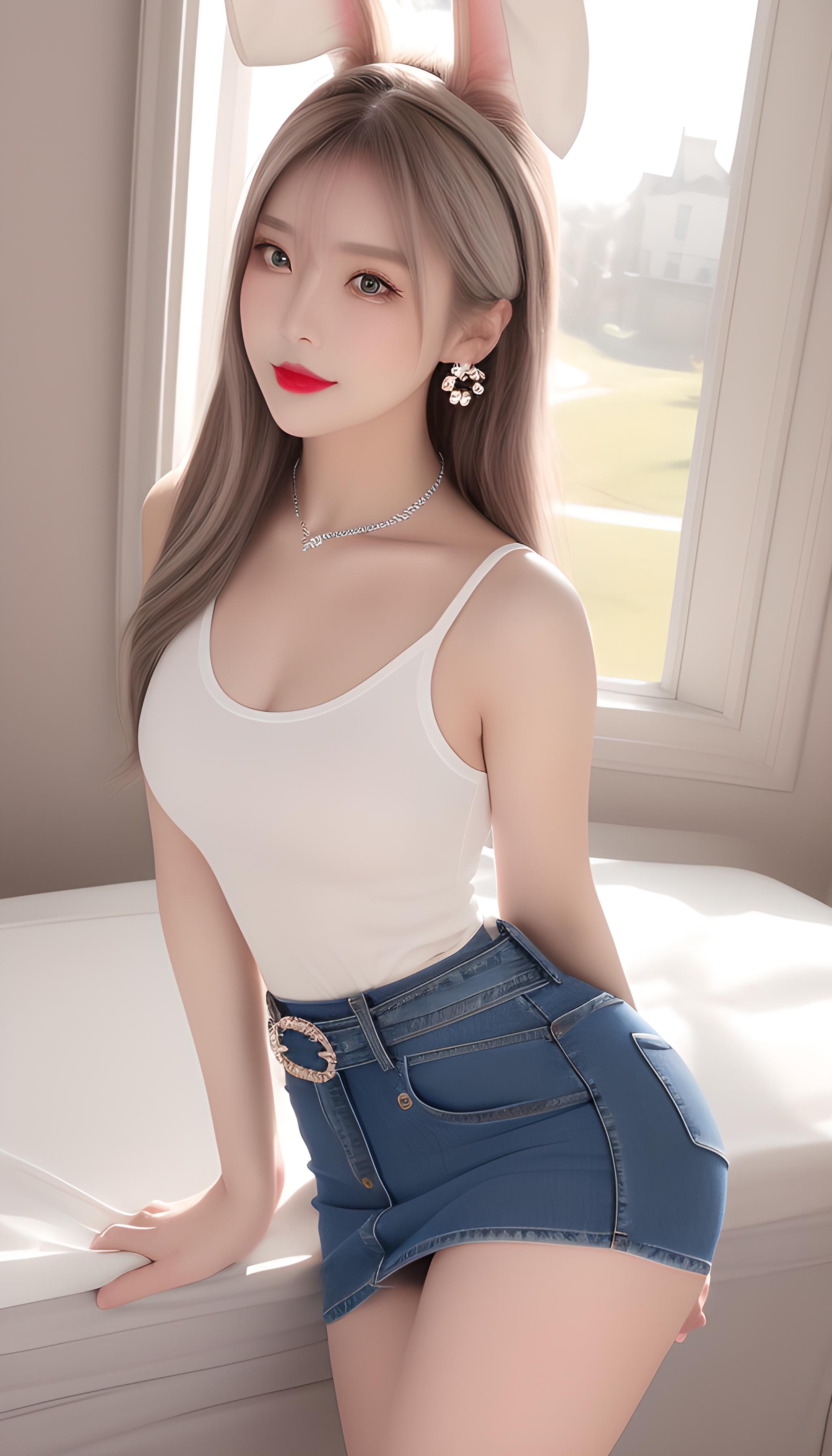 咒语(Prompt): 高清,全身特写,微距镜头,兔子耳朵,海军陆战队服,腰带。美少女,御姐,成熟,魅惑,性感,8k画质,最佳画质,锁骨,耳环,白色头巾,大长腿,翘臀,巨胸,美腿,背对观众,回眸,对镜头微笑,眼镜里有光,妩媚温柔,背影,丰满(((超短折叠裙))),(((紧身牛仔裤))),(((超短热裤))),露腿,完美身材,S型,完美身材比例,完美腿部线条,细腰,精致五官,非常可爱,水汪汪的大眼睛,紫色瞳孔,眼影,长睫毛,脸红,红色嘴唇,,银白的头发,阳光明媚,细节光线,优雅的姿势。背景豪宅,豪华卧室,豪华浴室。