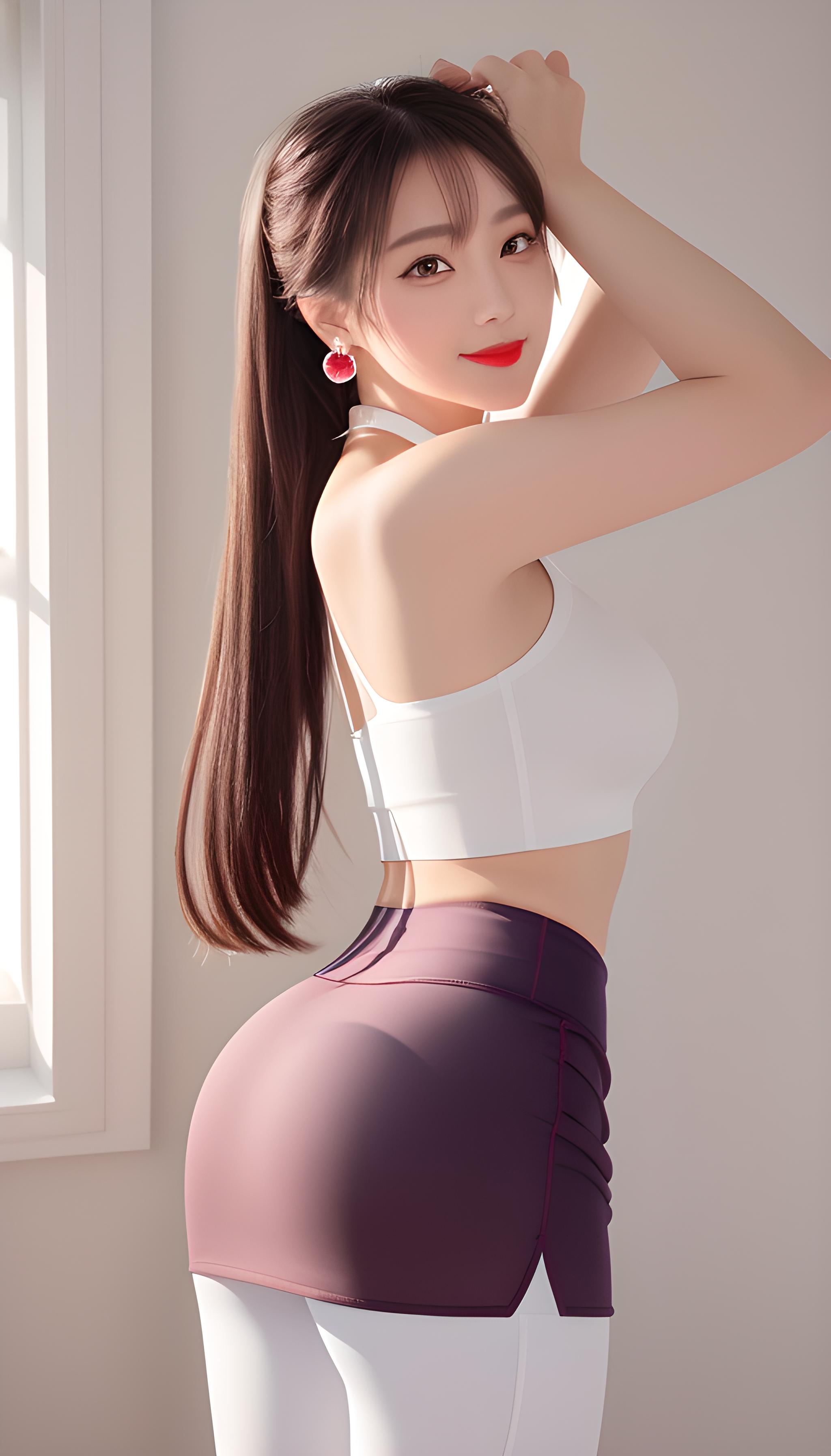 咒语(Prompt): 高清,全身特写,微距镜头,兔子耳朵,海军陆战队服,腰带。美少女,御姐,成熟,魅惑,性感,8k画质,最佳画质,锁骨,耳环,白色头巾,大长腿,翘臀,巨胸,美腿,背对观众,回眸,对镜头微笑,眼镜里有光,妩媚温柔,背影,丰满(((超短折叠裙))),(((紧身瑜伽裤))),(((超短热裤))),露腿,完美身材,S型,完美身材比例,完美腿部线条,细腰,精致五官,非常可爱,水汪汪的大眼睛,紫色瞳孔,眼影,长睫毛,脸红,红色嘴唇,,银白的头发,阳光明媚,细节光线,优雅的姿势。背景豪宅,豪华卧室,豪华浴室。