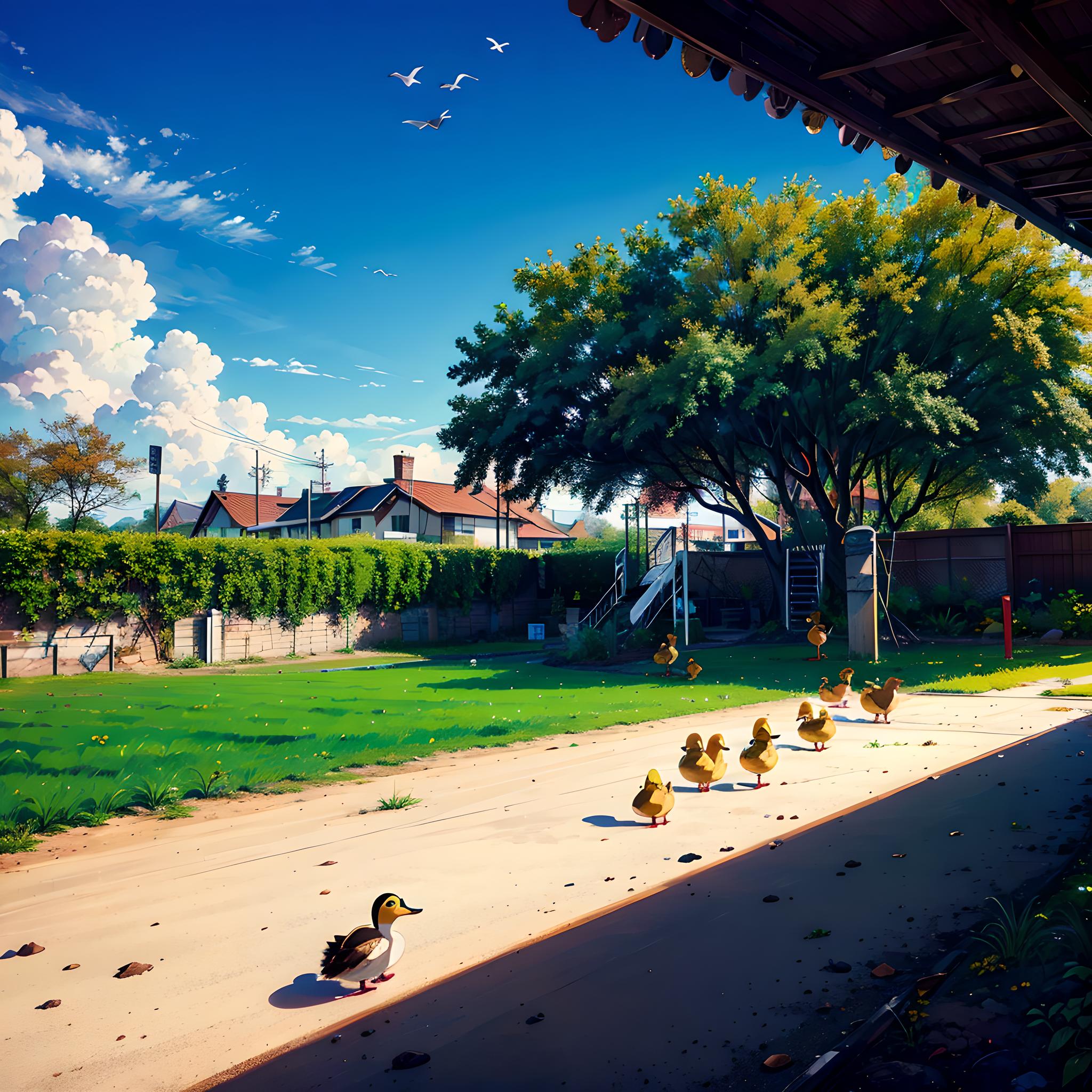 画面中,一群活泼可爱的鸭子在操场上自由自在地飞跑戏耍,充满了无穷的生机和活力。