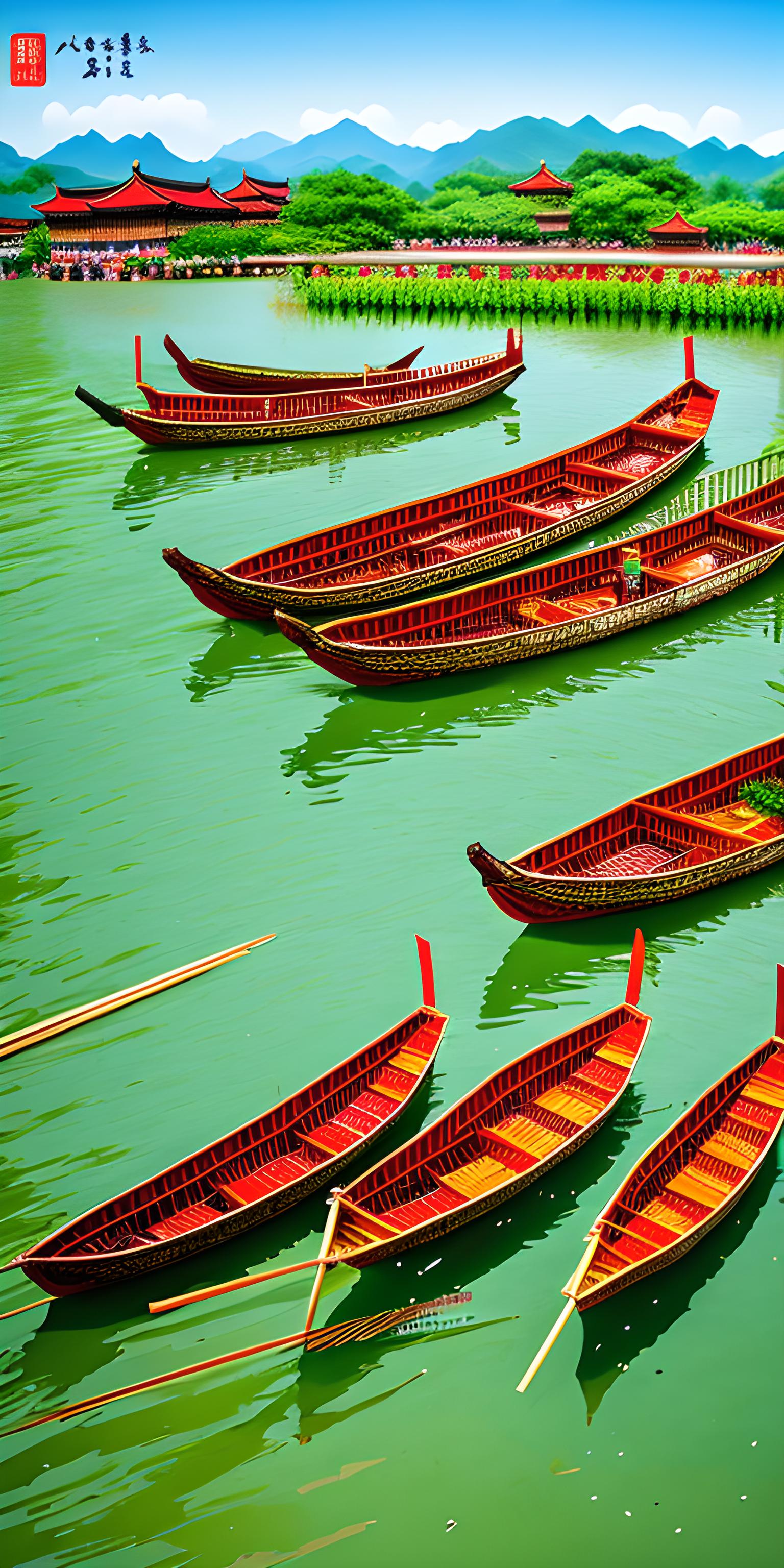 中国传统文化,端午佳节,龙船竞渡,粽子飘香,红艳菖蒲与绿茵艾草,跌宕起伏的光影,细致逼真的细节,令人陶醉的画面 --自动模式 --风格2 --auto --s2