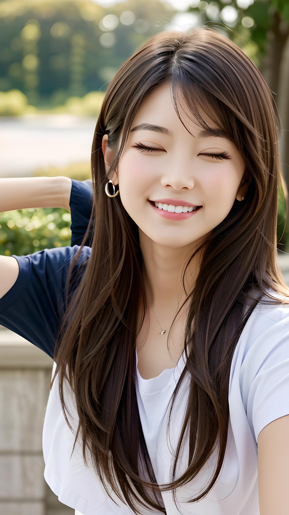 1girl,brown_eyes,brown_hair,closed_mouth,half-closed_eyes,light_smile,lips,long_hair,looking_at_viewer,nose,realistic,shirt,short_sleeves,smile,solo,t-shirt,upper_body,white_shirt