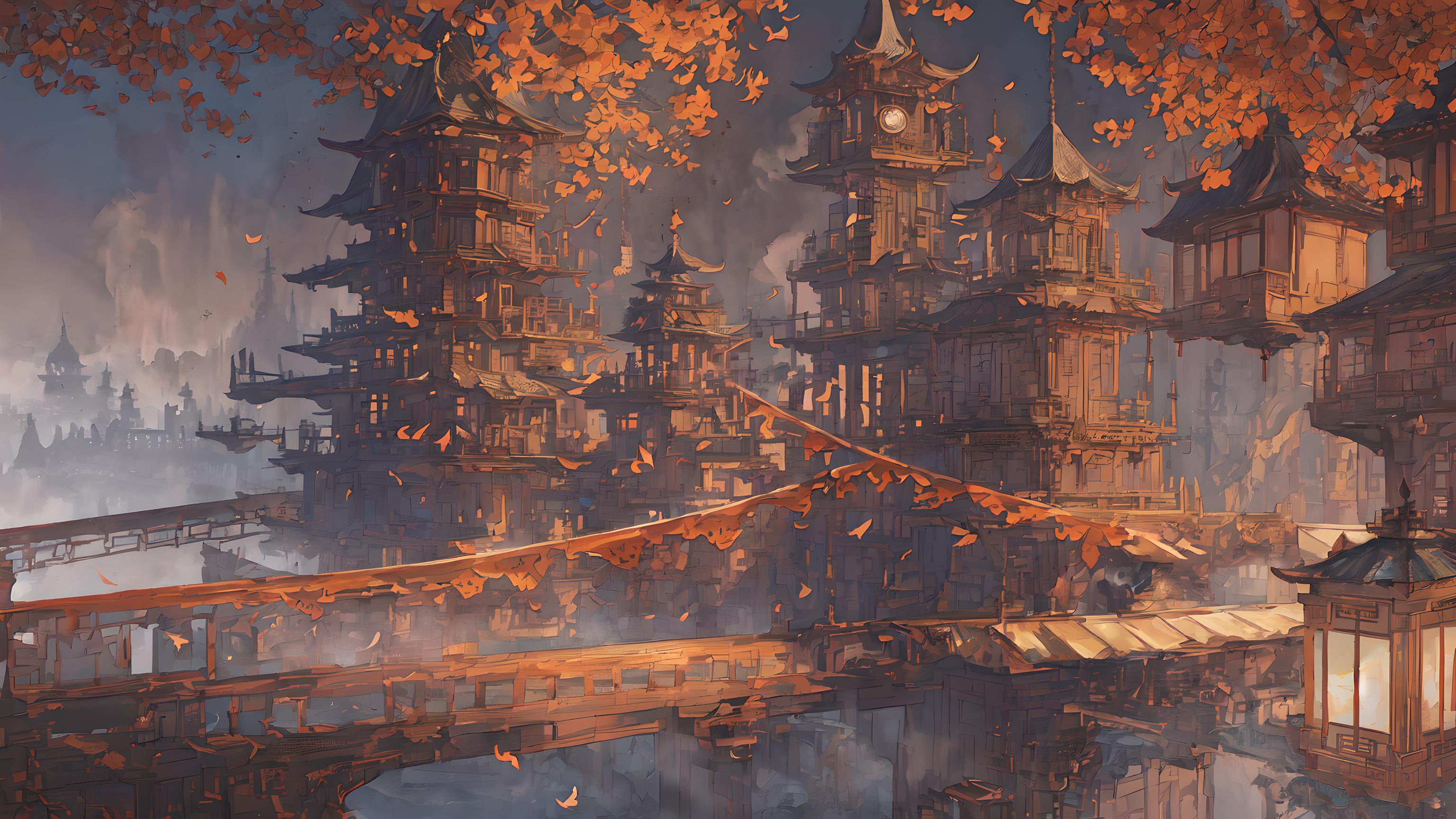 蒸汽朋克,古风,全景,火烧云,秘境法