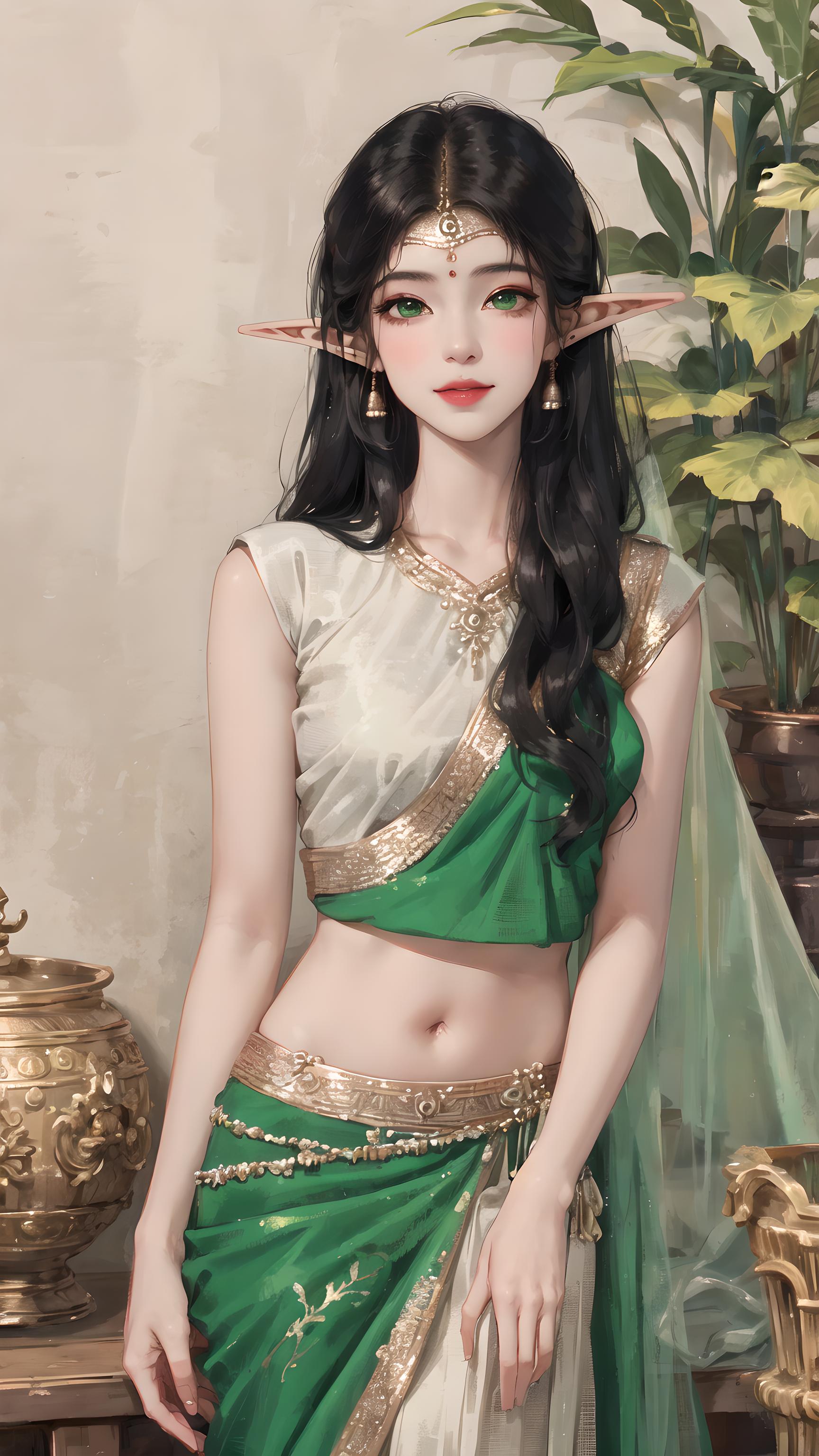 masterpiece,best quality,utlra detailed,illustration,wallpaper,cg,solo,pale skin,((one girl)),((elf)),pure girl,black hair,((long hair)),wavy hair,smile,((green eyes)),jungle,Indian architecture,((indian clothes)),((saree)),((莎丽服)),((green clothes)),御姐,高冷,马甲线,crop top