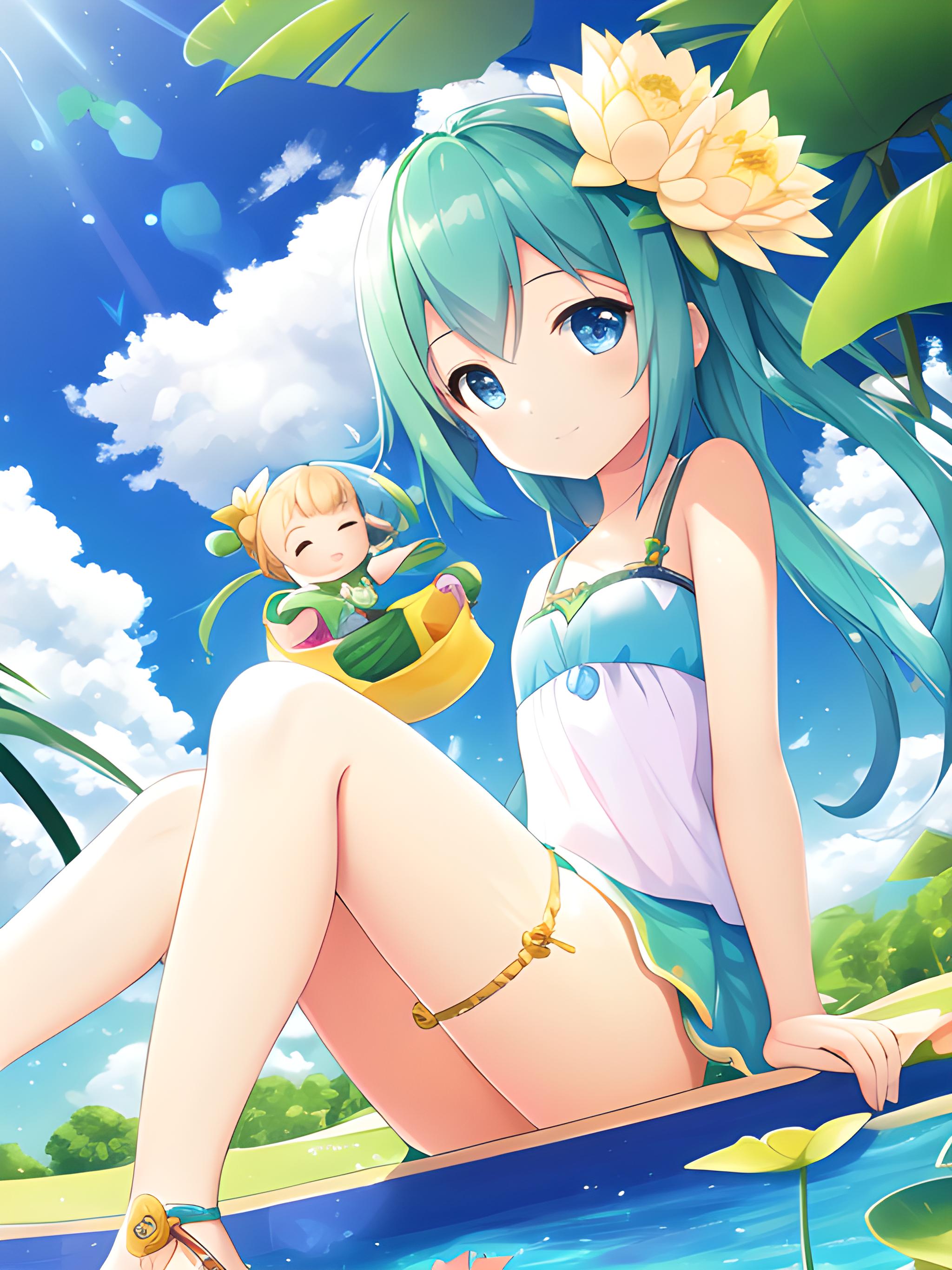 illustration rendering, the picture shows a very cute girl sitting on a lotus leaf, with a happy