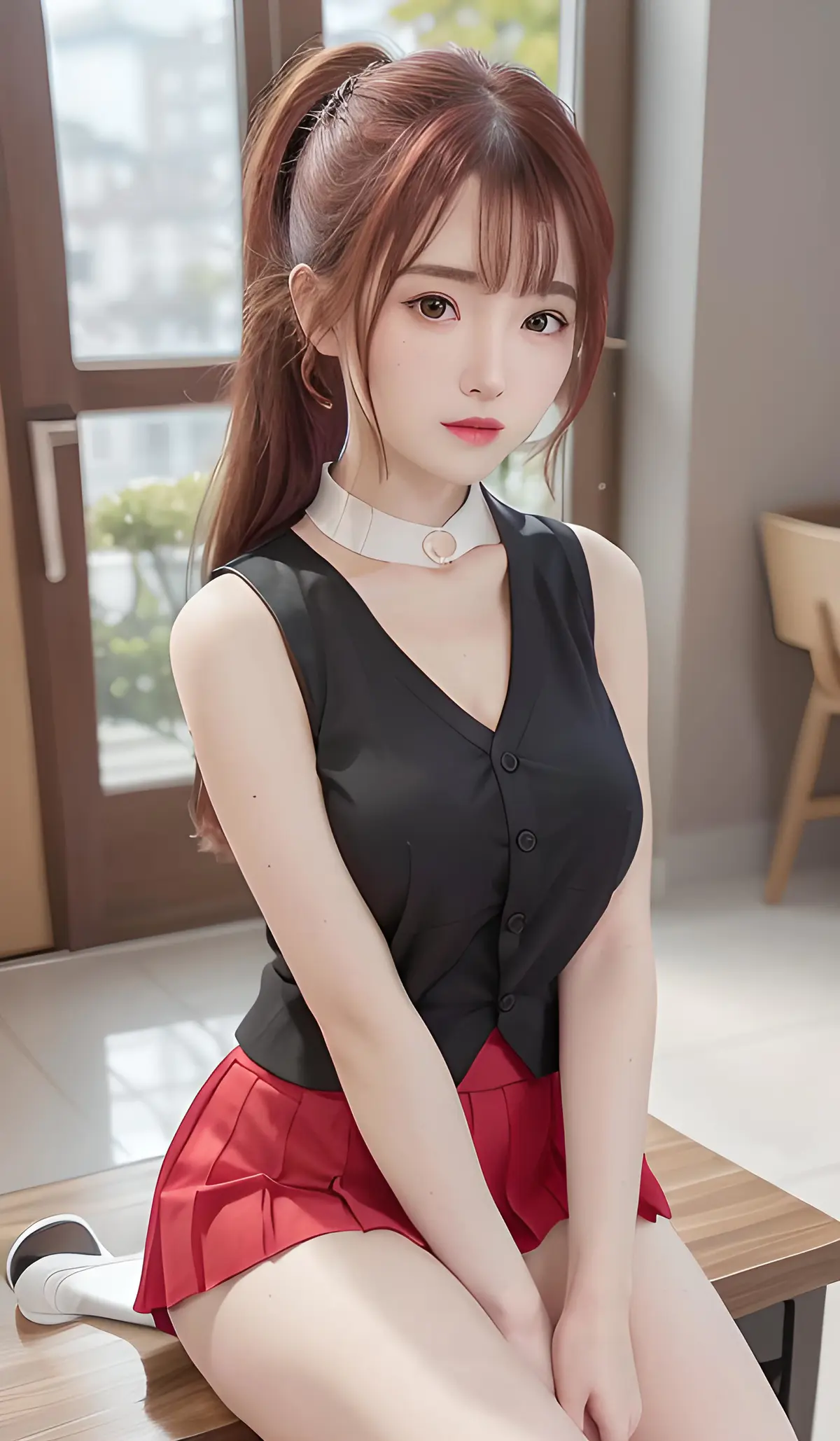 大师作品,最好画质,更高质量,超高分辨率,8k分辨率,高细节,景深,全景,长焦镜头,精致的五官,完美的脸,女性,美少女,((女神)),单人,(职场女性),水汪汪大眼,害羞,(挑逗笑容),(头发过肩),(红发),(斜刘海),(马尾辫),扎头发,(头花),发夹,手链,项圈,耳钉,((百褶裙)),(侧身坐),面向观者,动态角度,(夏天),(满月),(流星雨),(花海),七夕节,((背心)),((湿身)),((人字拖)),(渔网袜)
