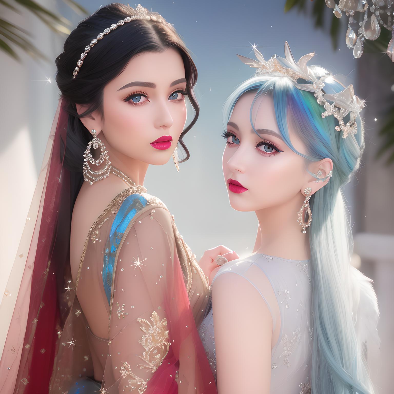 大师作品,极其详细的刻画,女神,色彩缤纷的虹彩尾巴和闪闪发光的妆容,魅力,短,色调,圆脸,橄榄色皮肤,黑发,灰蓝色眼睛,短鼻子,撅起嘴唇,后移下巴,齐肩发,直发,假鹰,垂坠耳环、红色透明唇膏