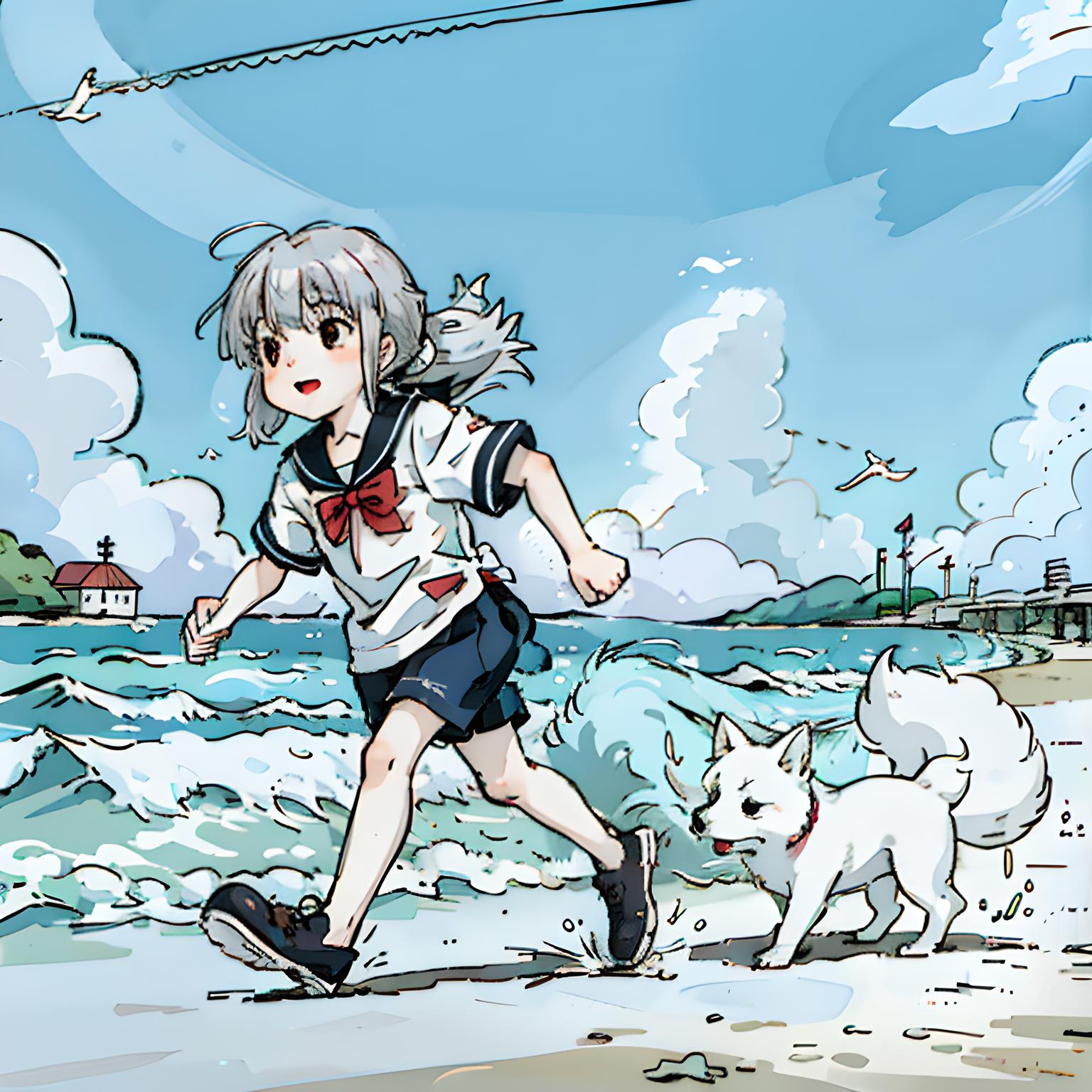 穿着美丽的衣服,到了海浪滔滔的海边,在小狗的陪伴下在海岸奔跑,听着海浪拍打沙滩的声音,吹着拂面的海风