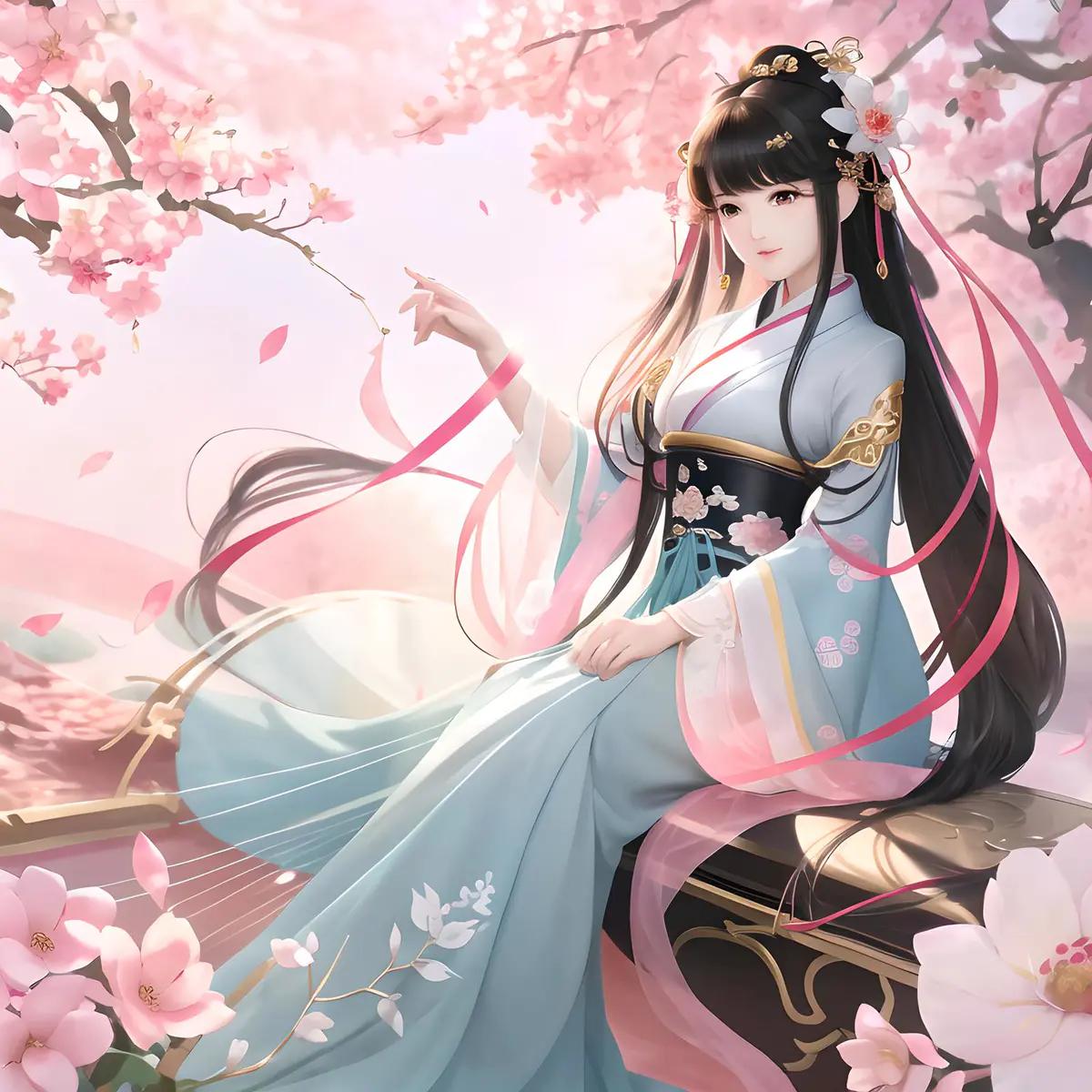 江南风华,苗条可爱的少女,身着古代汉服,手执琵琶,纤纤玉指,可爱的中国女孩,可爱腮红,超级可爱的女孩,乌黑长发,美丽的桃花眼,发簪,丝带,全身,正视图,赤壁风格,可爱风格,泡泡玛特,卡通风格,中国神话风格