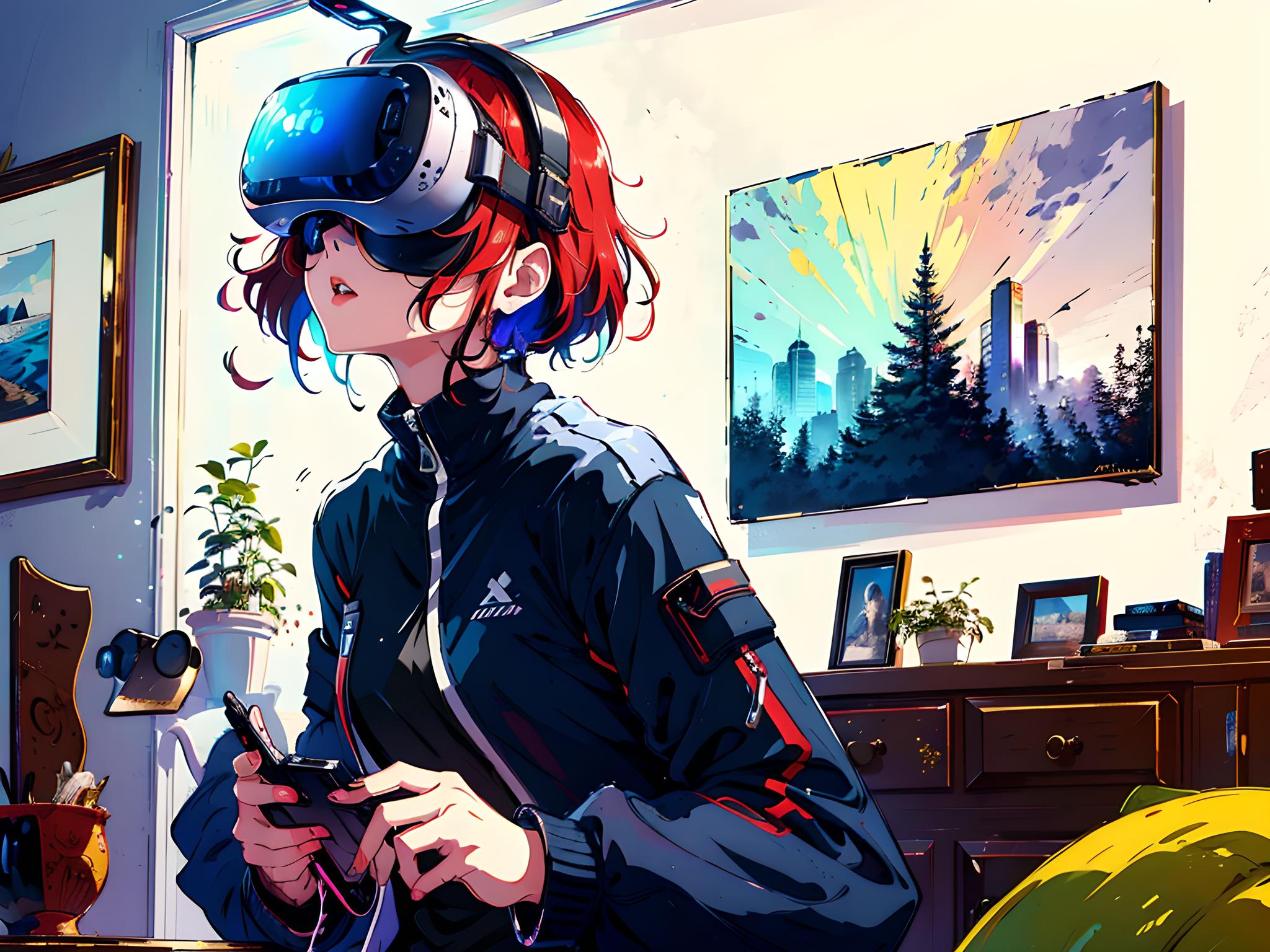 A girl with a futuristic technology, wearing a VR device on her face, natural and lively body movements, beautiful clothing combinations, and using VR devices in the scene. The background is a home environment, with master colors, popular styles on art websites, unparalleled beauty, and a bright and warm home environment,