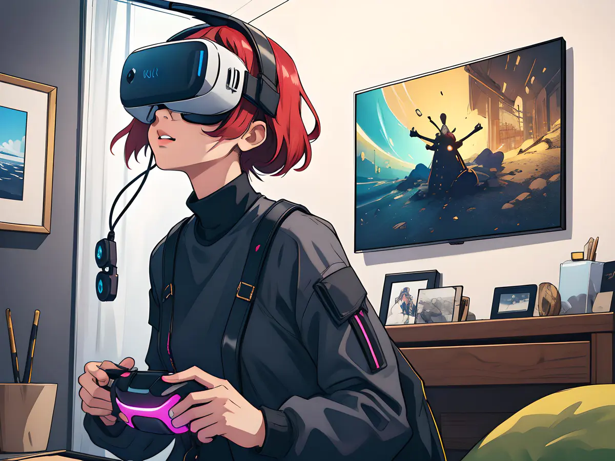 Rokid AR,A girl with a futuristic technology, wearing a VR device on her face, natural and lively body movements, beautiful clothing combinations, and using VR devices in the scene. The background is a home environment, with master colors, popular styles on art websites, unparalleled beauty, and a bright and warm home environment,
