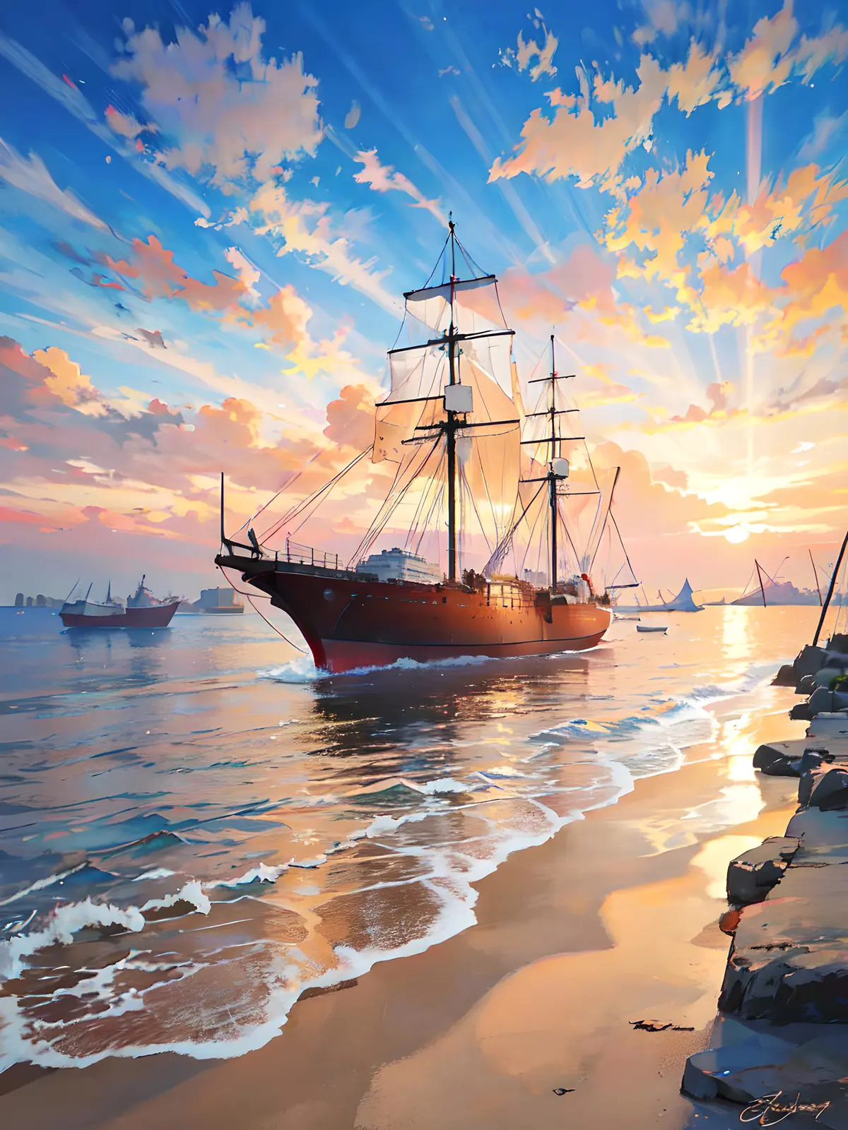 夕阳的温暖光芒照亮整个场景,营造出宁静浪漫的氛围。