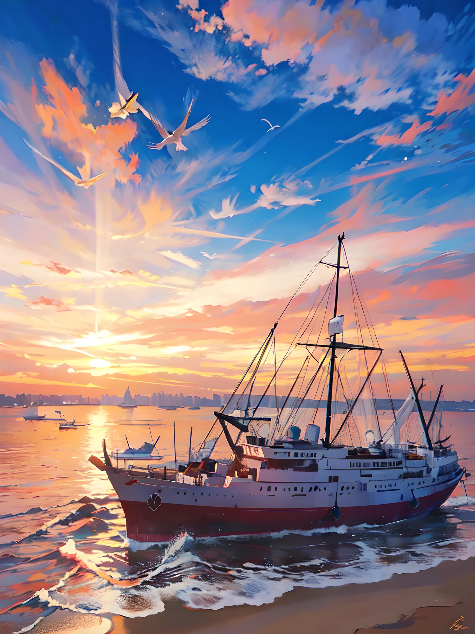-光照:夕阳的温暖光芒照亮整个场景,营造出宁静浪漫的氛围。