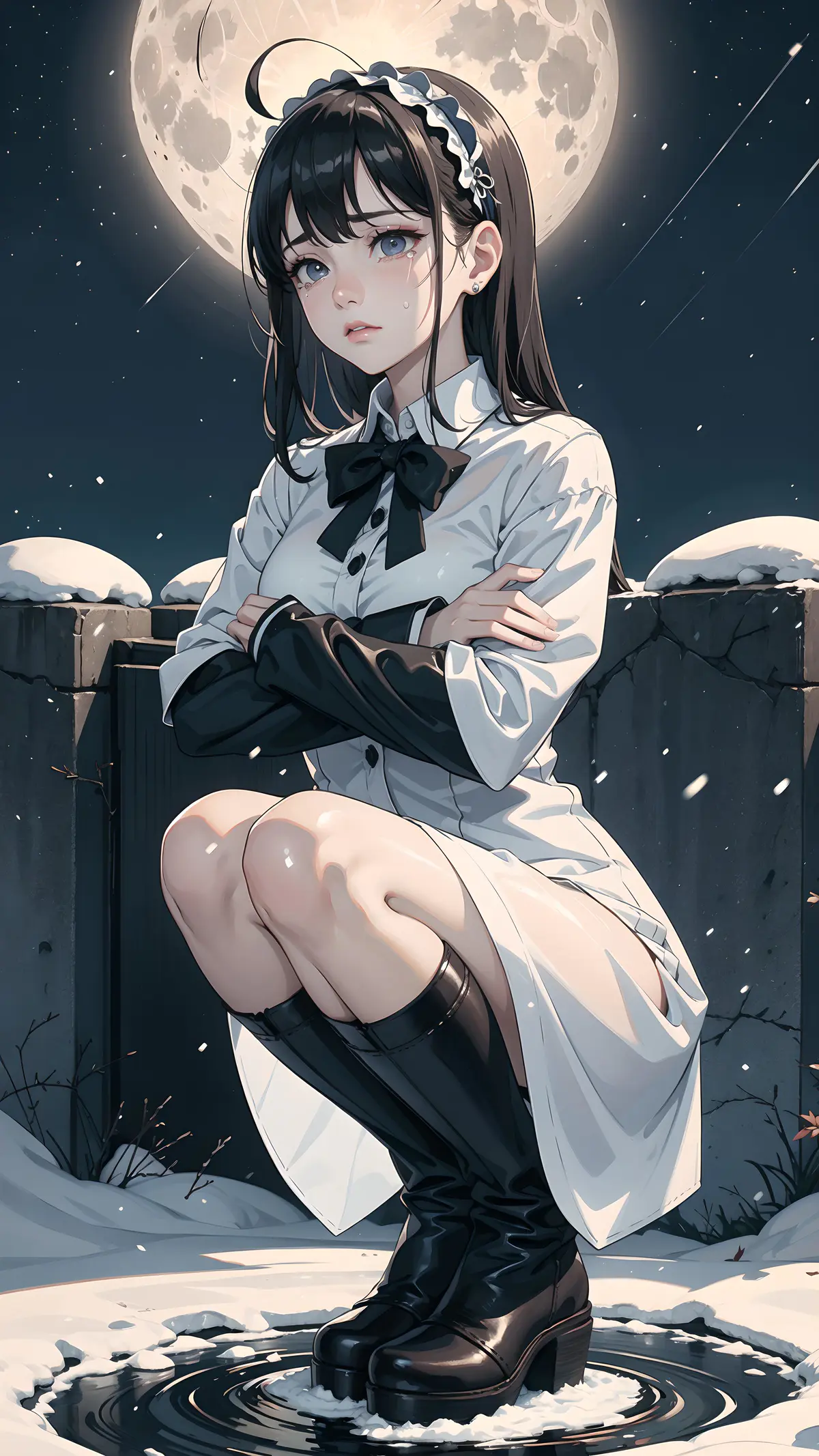 8k resolution, masterpiece, best quality, female, bishoujo, beggar, solo, student, short eyebrows, empty eyes, chestnut mouth, expressionless, turn pale, shaded face, depressed, tears, sad, hair over shoulder, black hair, hair between eye, ahoge, hair behind ear, lolita hairband, sapphire brooch, white shirt, summer dress, school uniform, wet clothes, lolita fashion, knee boots, socks, squatting, hand on forehead, looking away, looking to the side, against wall, crossed arms, in winter, full_moon, stars, snow, ice, meteor shower, flower sea, mid-autumn festival, Tyndall effect
