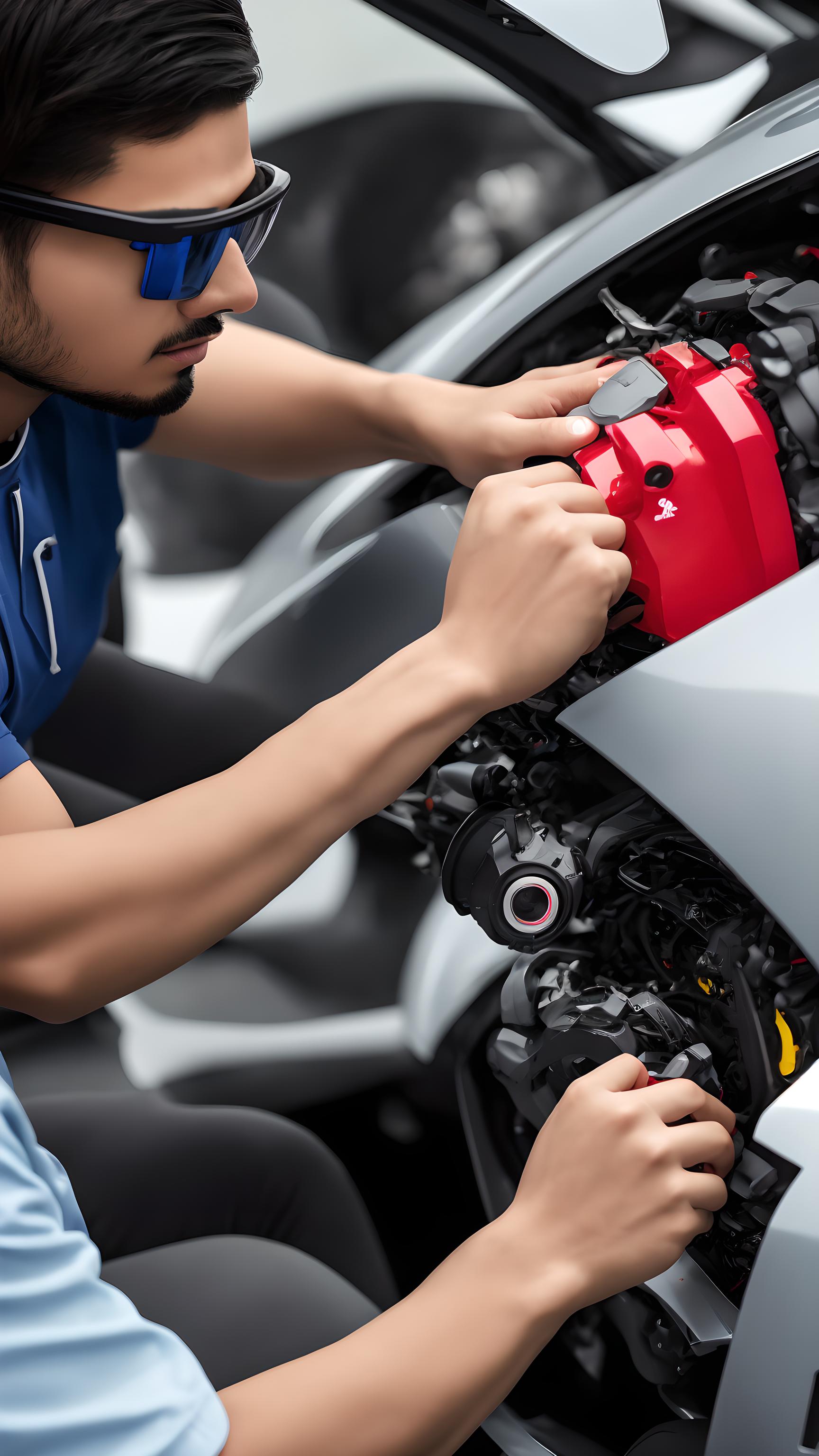 一名技术工人正在佩戴Rokid AR眼镜组装一台复杂的跑车