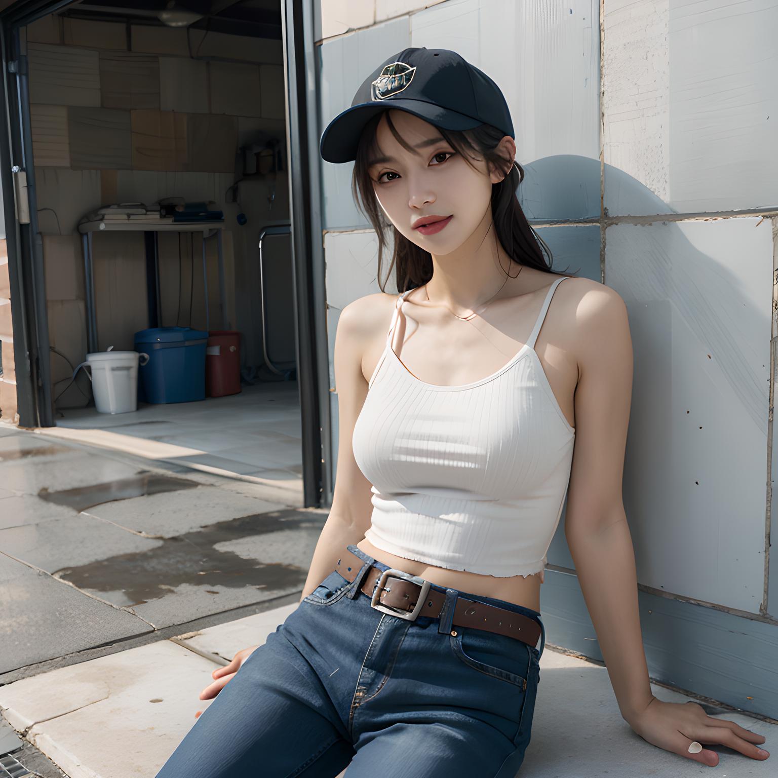 1girl,backwards_hat,bare_shoulders,baseball_cap,bathroom,belt,black_hair,blue_headwear,blue_pants,brick,brick_floor,brick_wall,building,casual,chain-link_fence,collarbone,dark-skinned_female,day,denim,facing_viewer,fence,full_body,hat,hexagon,honeycomb_(pattern),honeycomb_background,jeans,open_mouth,outdoors,pants,pavement,pool,poolside,road,rooftop,sleeveless,sleeveless_shirt,smile,solo,stone_floor,stone_wall,tank_top,tile_floor,tile_wall,tiles,torn_clothes,torn_jeans,torn_pants,wall