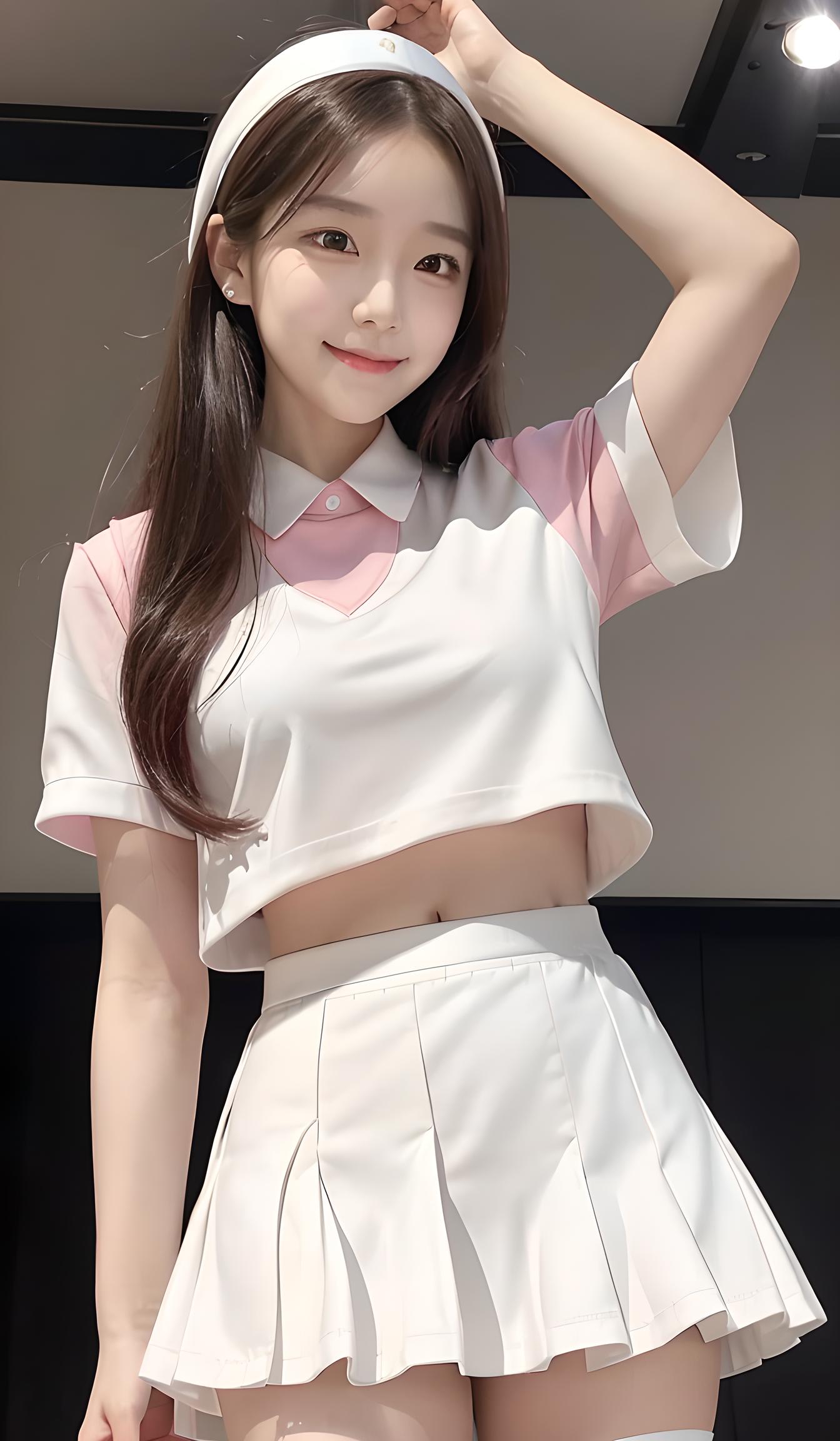 1女孩,身穿((粉色包臂裙)),((裙长:短裙)),((腰型:低腰)((白色制服)),站立看着观众,面带微笑