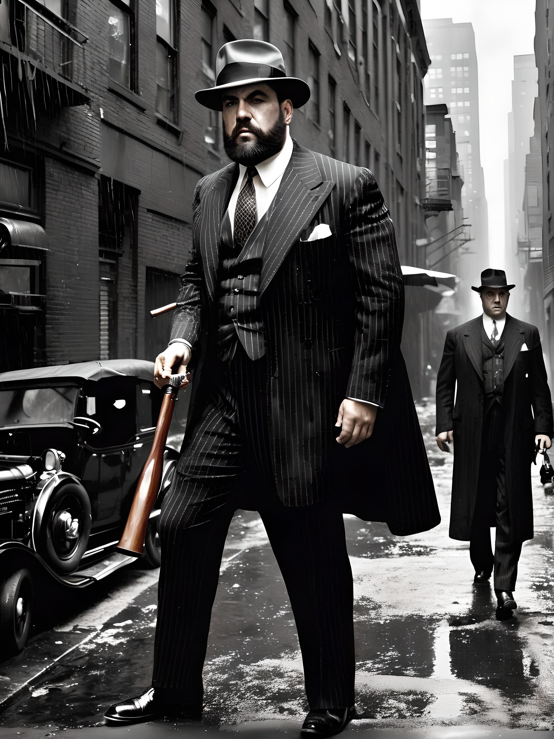 络腮胡 黑帮大佬 美国1930年代 禁酒令时代 条纹西装 左手拿棒球棍 右手拿汤普逊冲锋枪 恶棍 杀气腾腾 纽约 小巷子 阴雨天