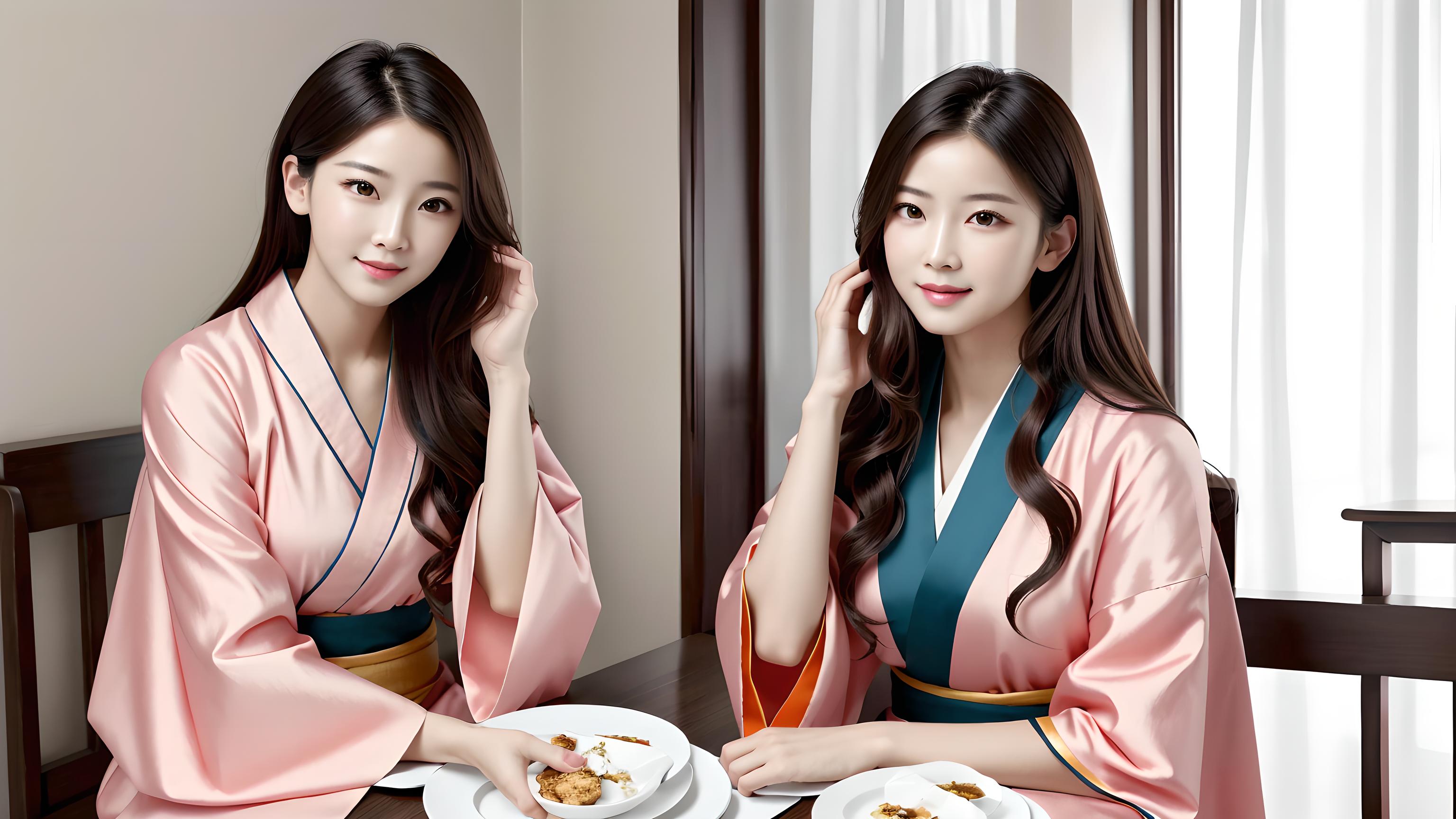 高分辨率,超详细,调整头发,亚洲,黑眼睛,黑发,手放在自己的头上,头枕,中国衣服,汉服,嘴唇,长发,橘子,鼻子,粉色和服,盘子,逼真,微笑,高质量,汉服小姐姐