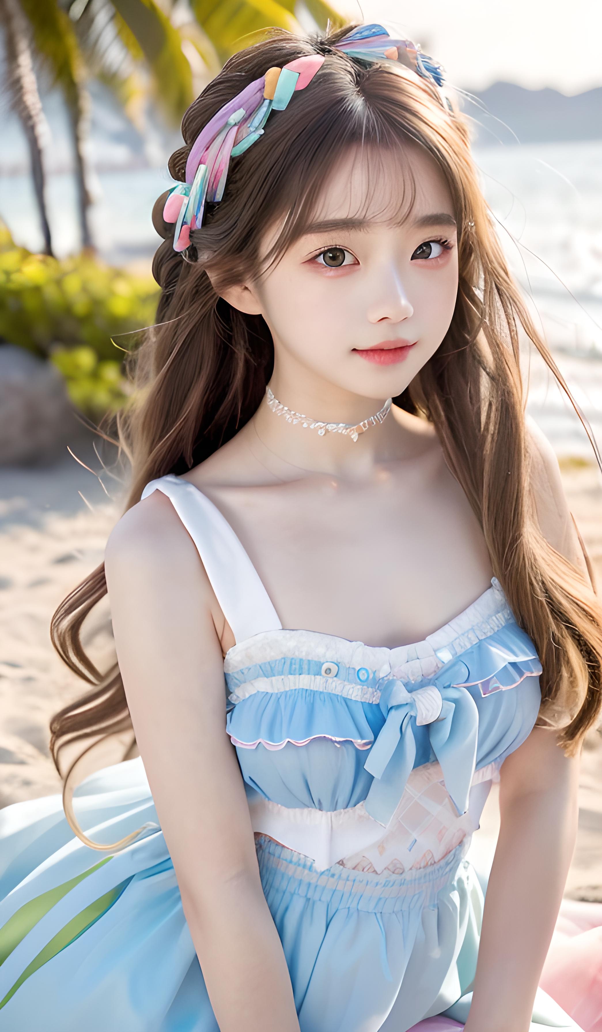 沙滩,海边,高细节,8k分辨率,超高分辨率,一个稚嫩少女可爱的少女,彩虹色亮光长发麻花辫子,彩色清澈眼眸,头戴五颜六色的花,(顺滑的头发,锁骨,精致完美的五官最美的大眼睛,长长的睫毛,眼睛甜美有卧蚕,微笑,动态角度,极致画质,最高精 度,精确完美的人体结构,穿着五颜六色裙子不暴露,,头发上有饰品,在海边