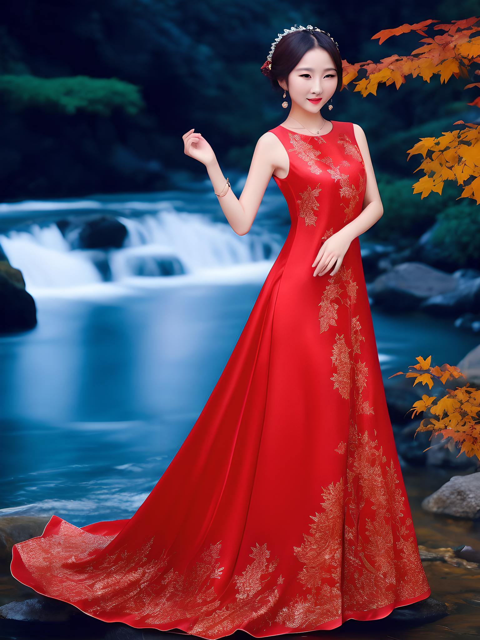 一红裙美女河边留影
