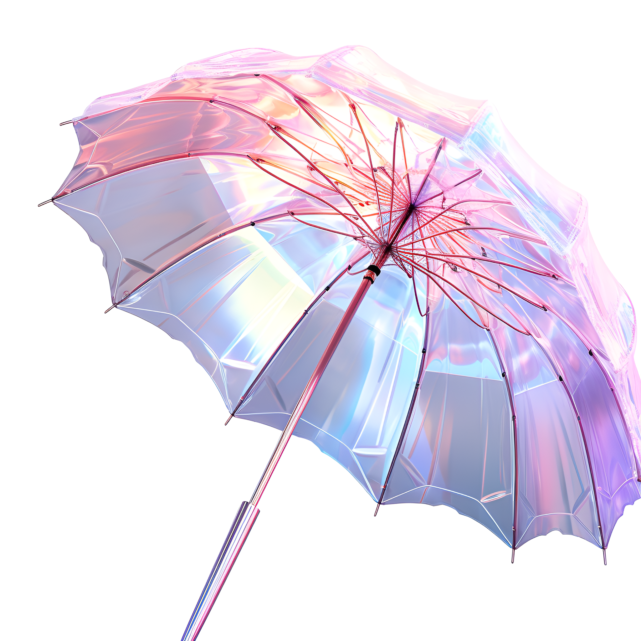 An umbrella, iridescent foil, halo gradient, vertical up,, close-up, front view, futuristic, digital art,, white background, passionate, exuberant